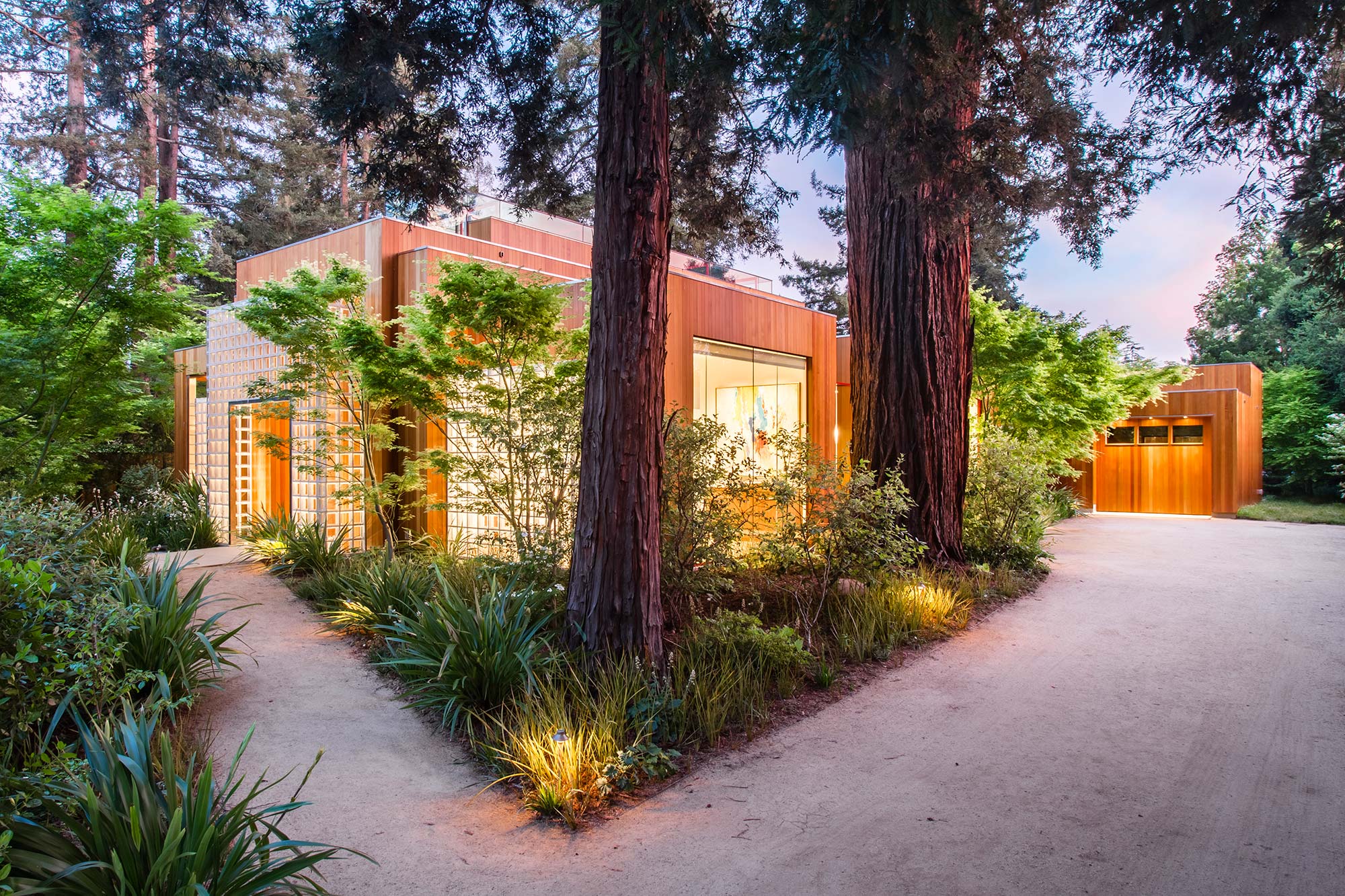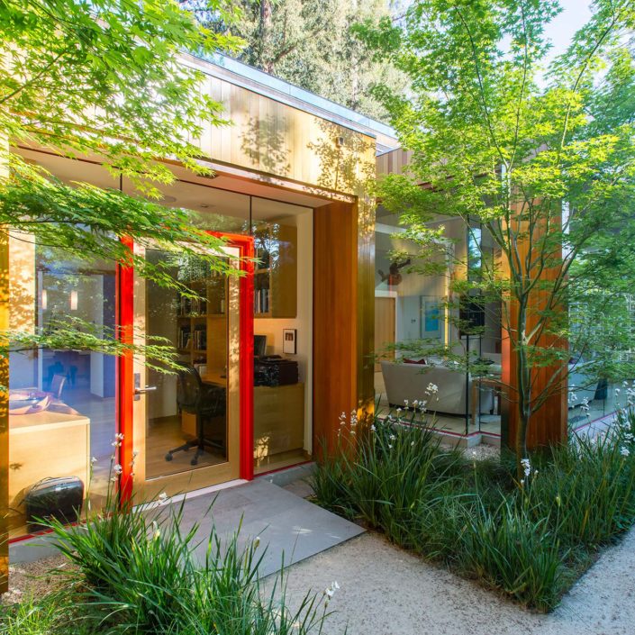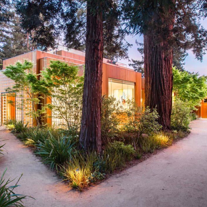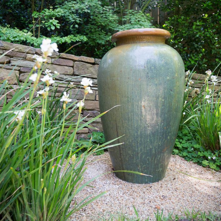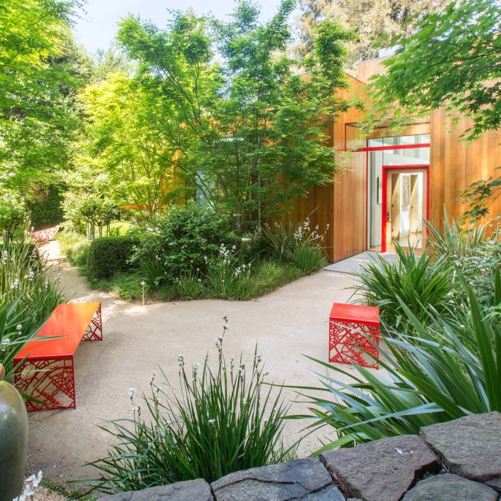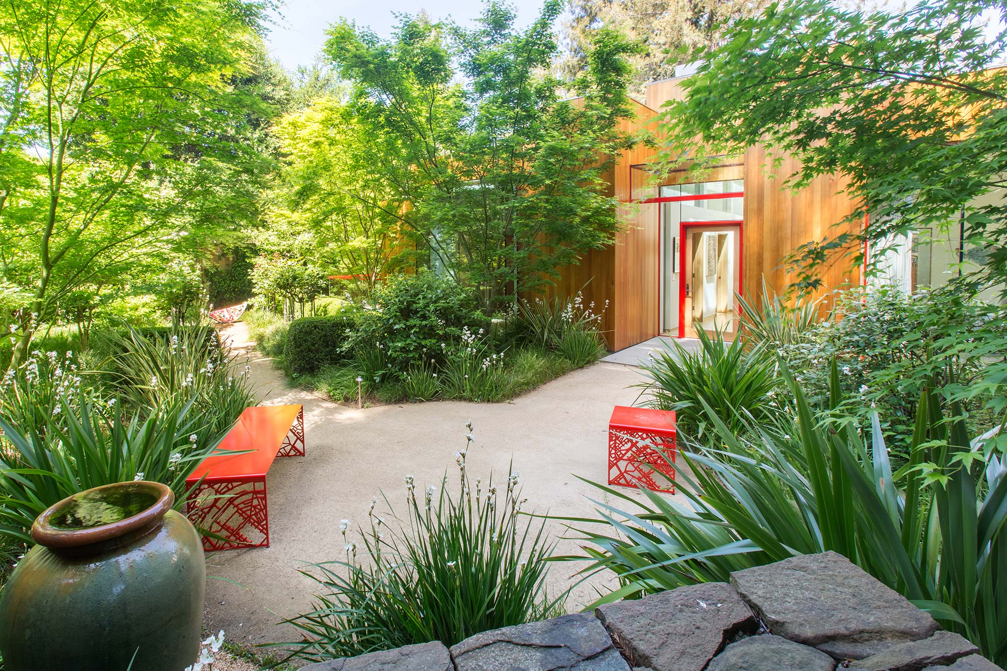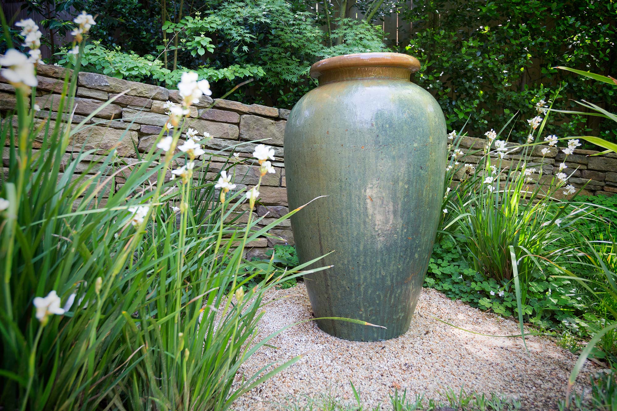 Rear Zen gardens with urn fountain, stacked stone walls, and native, drought-tolerant landscaping.