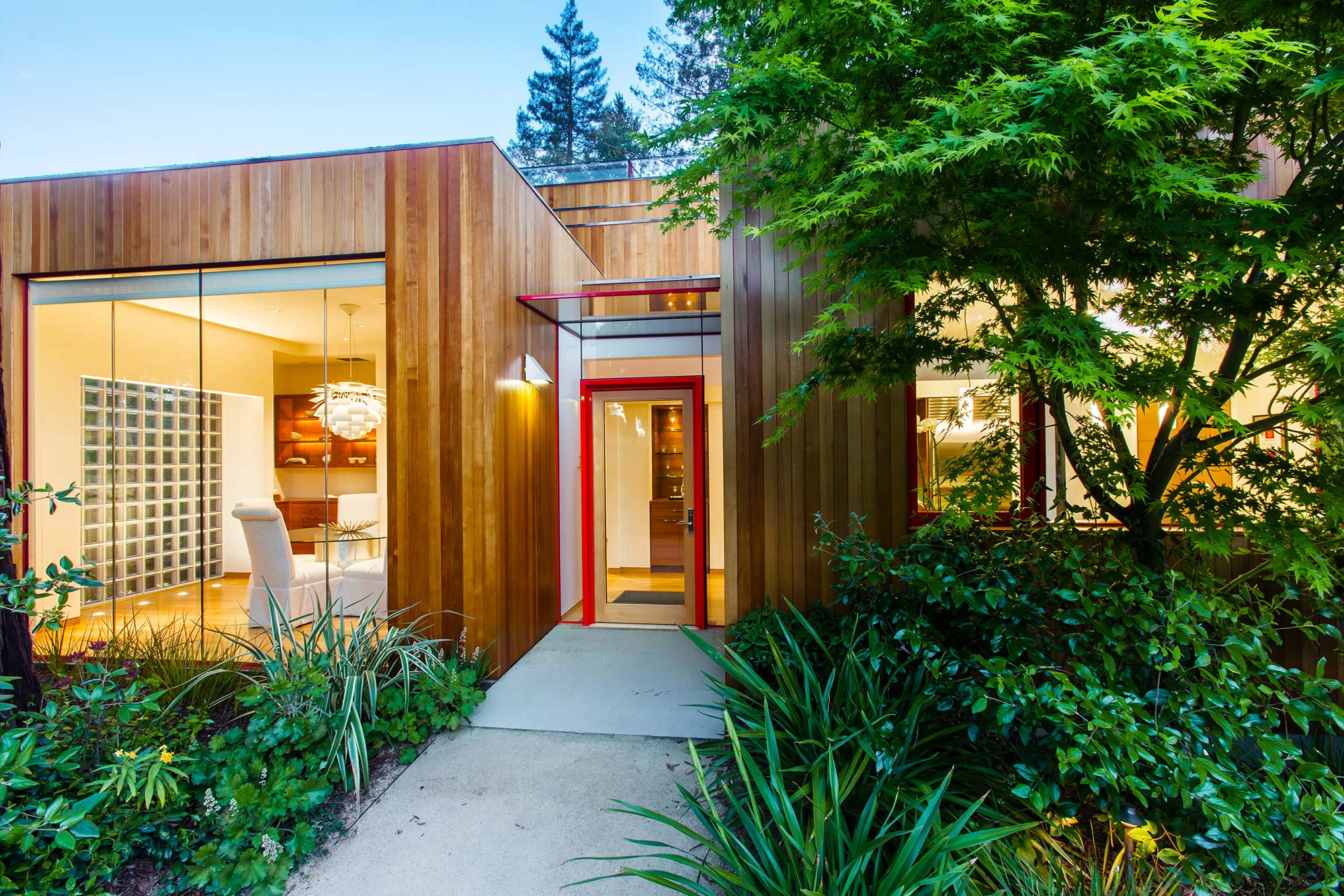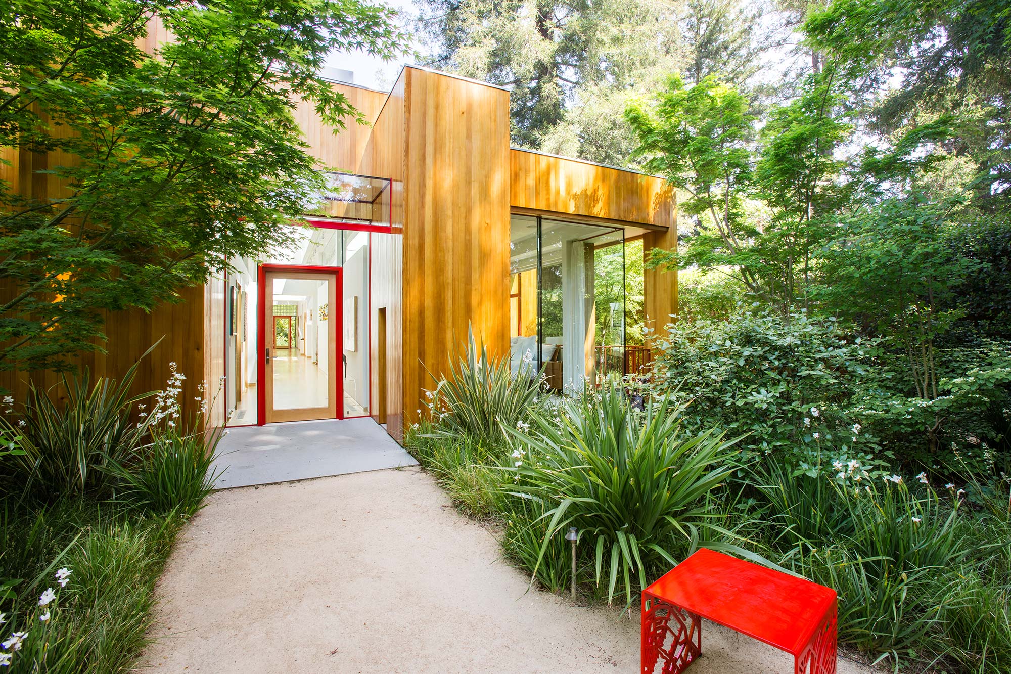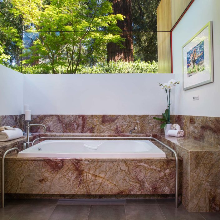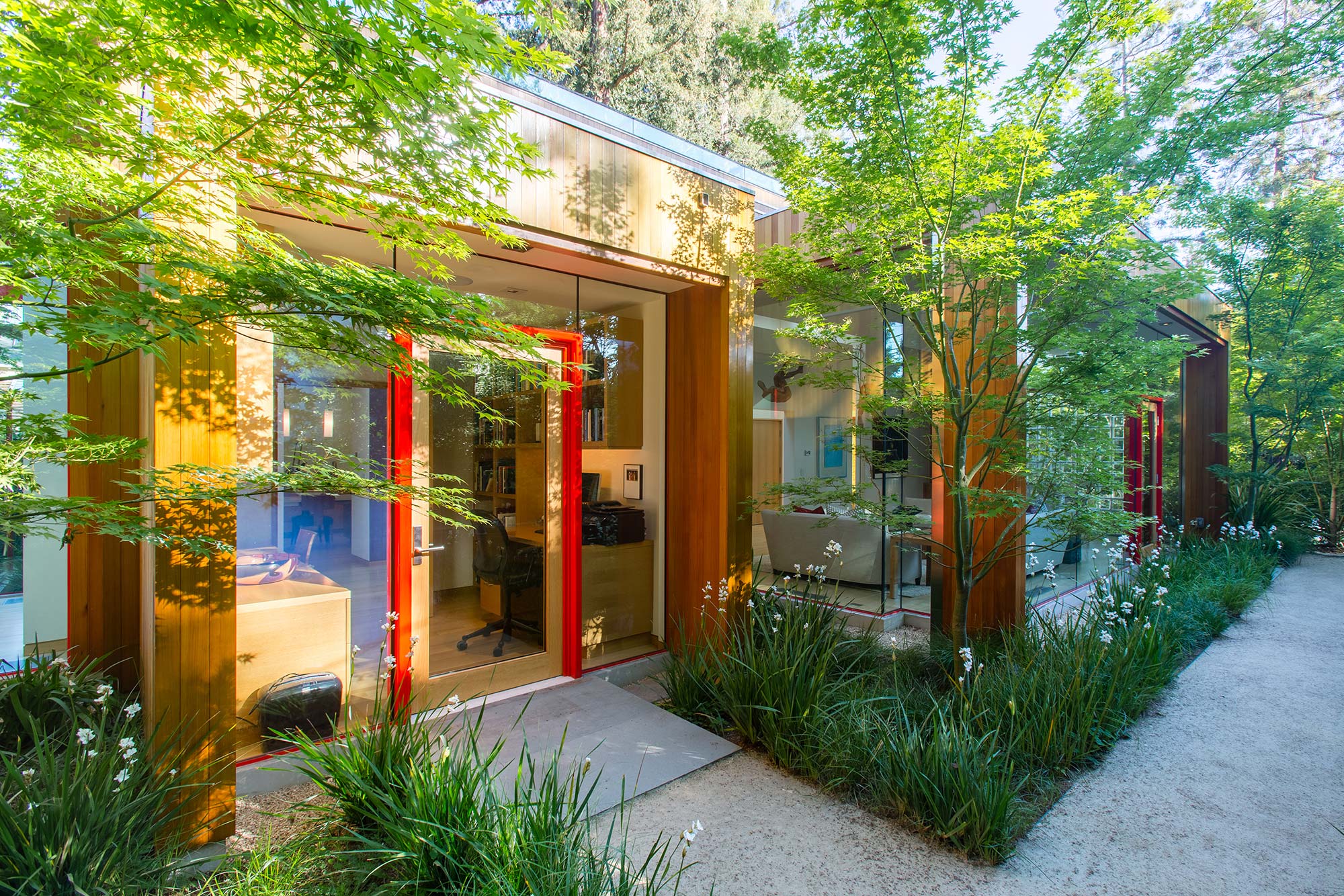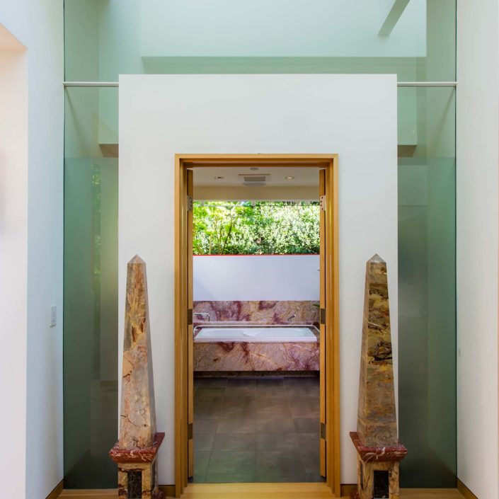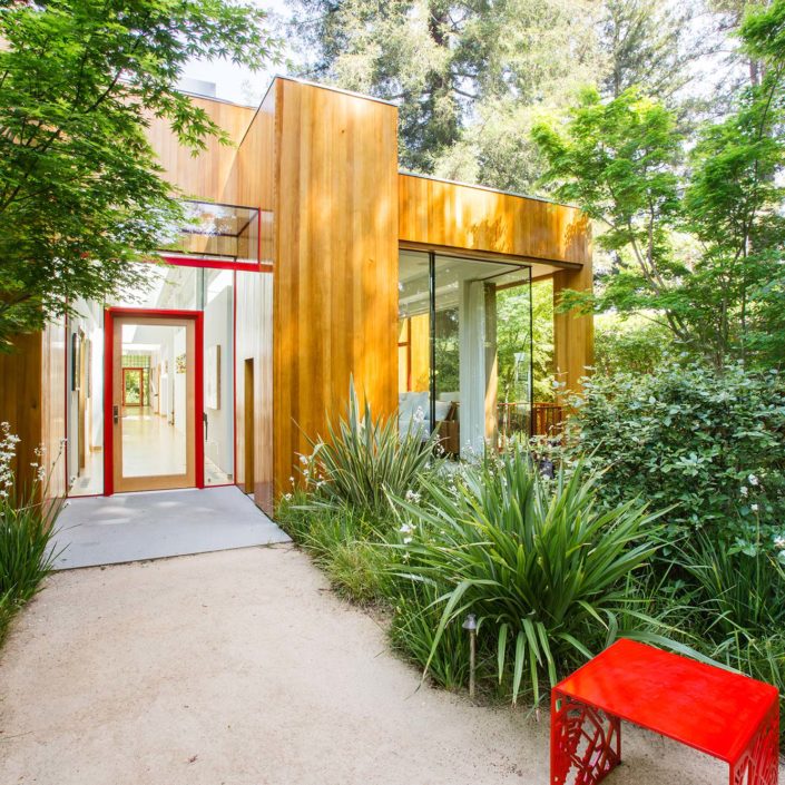 Rear Zen gardens with urn fountain, stacked stone walls, and native, drought-tolerant landscaping.