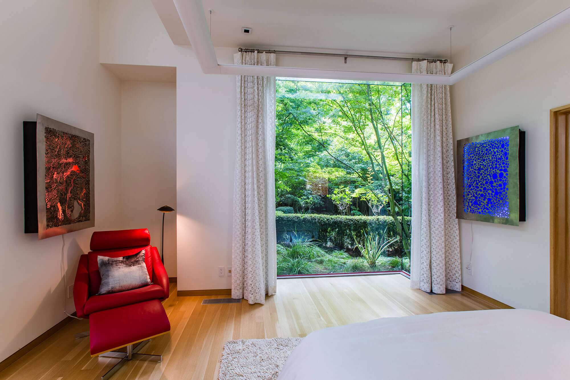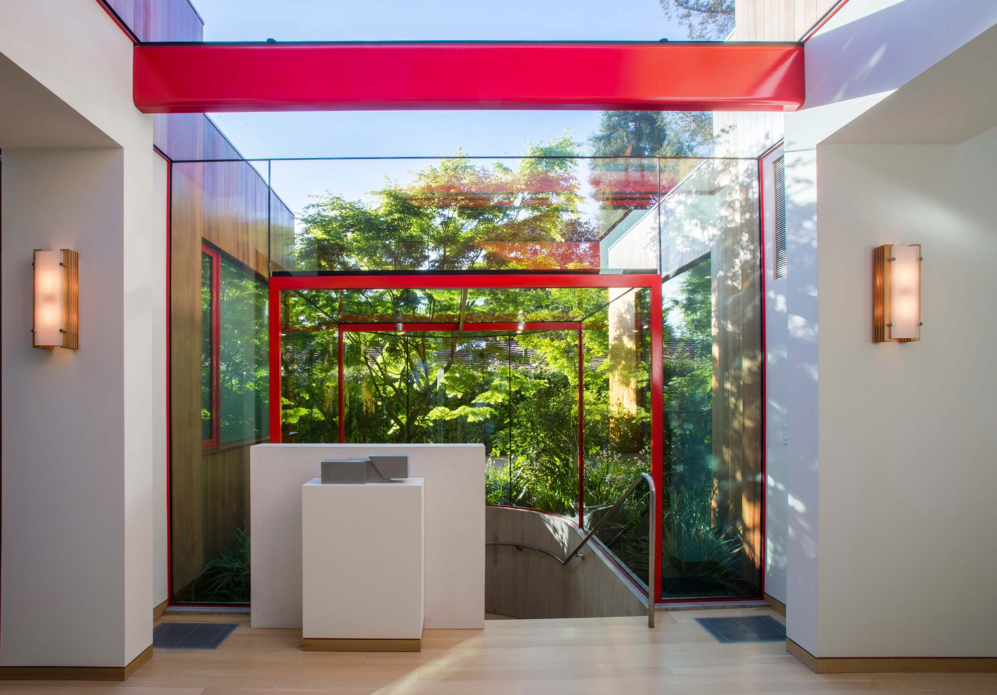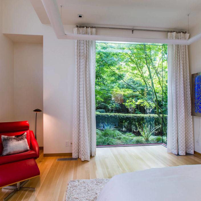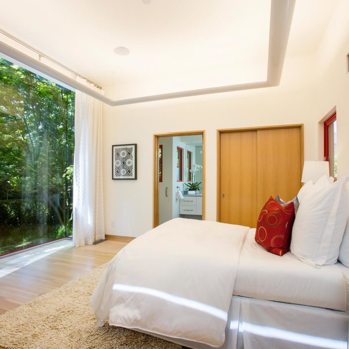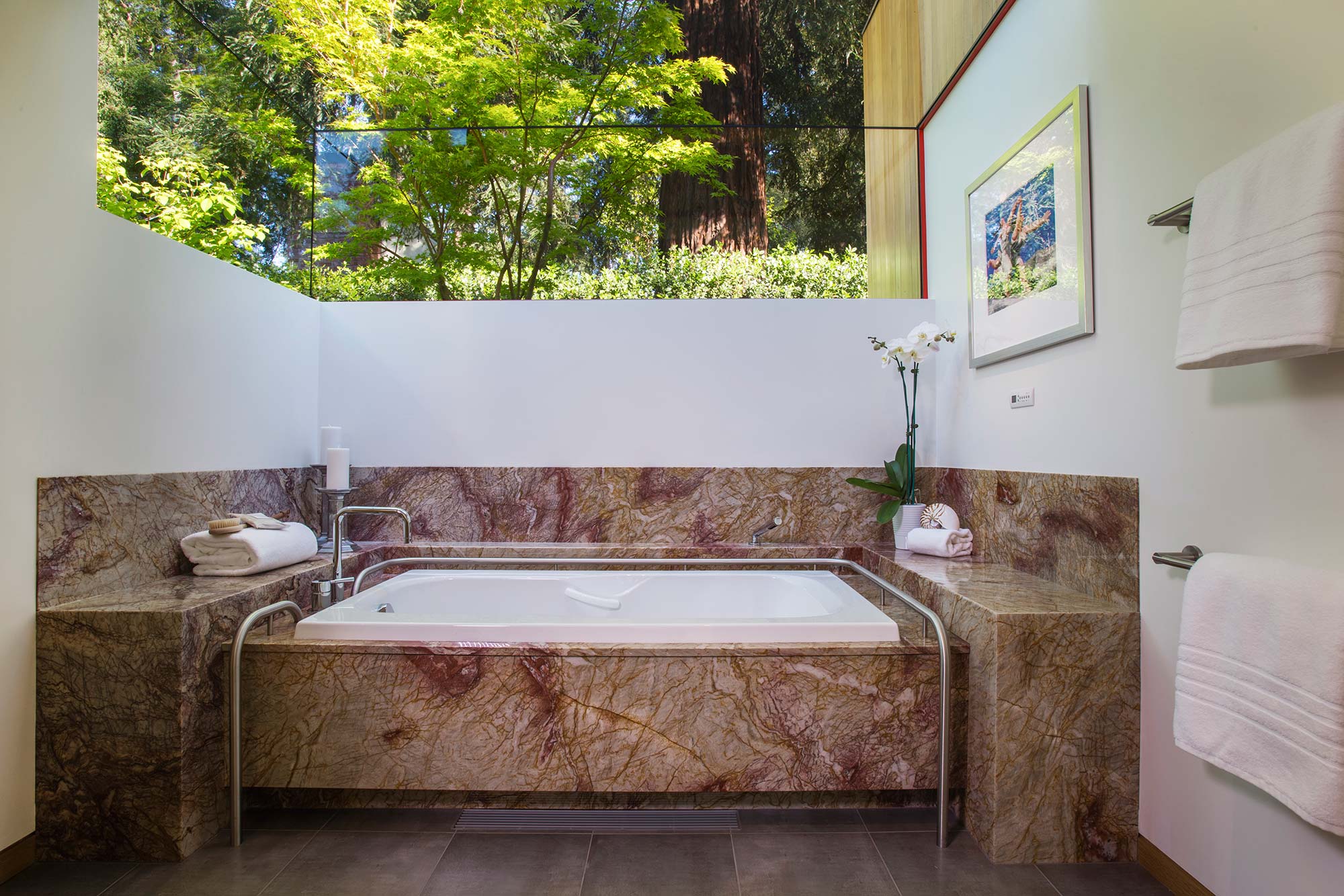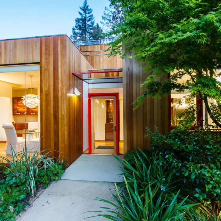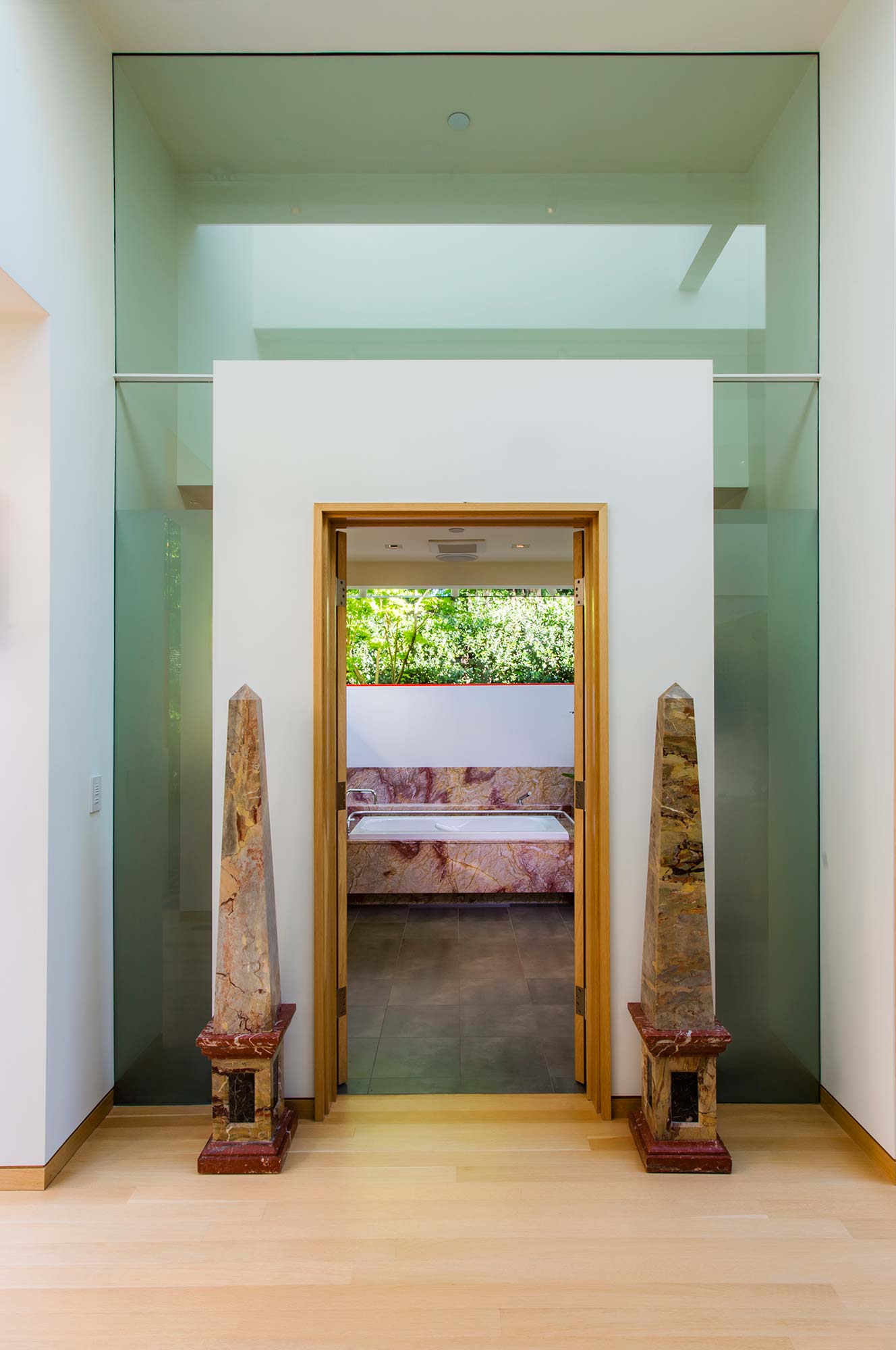 Rear Zen gardens with urn fountain, stacked stone walls, and native, drought-tolerant landscaping.