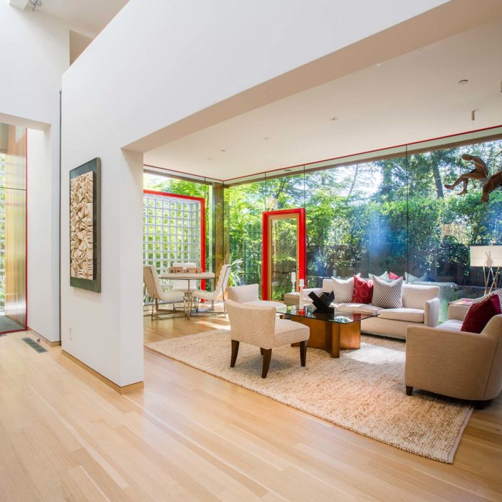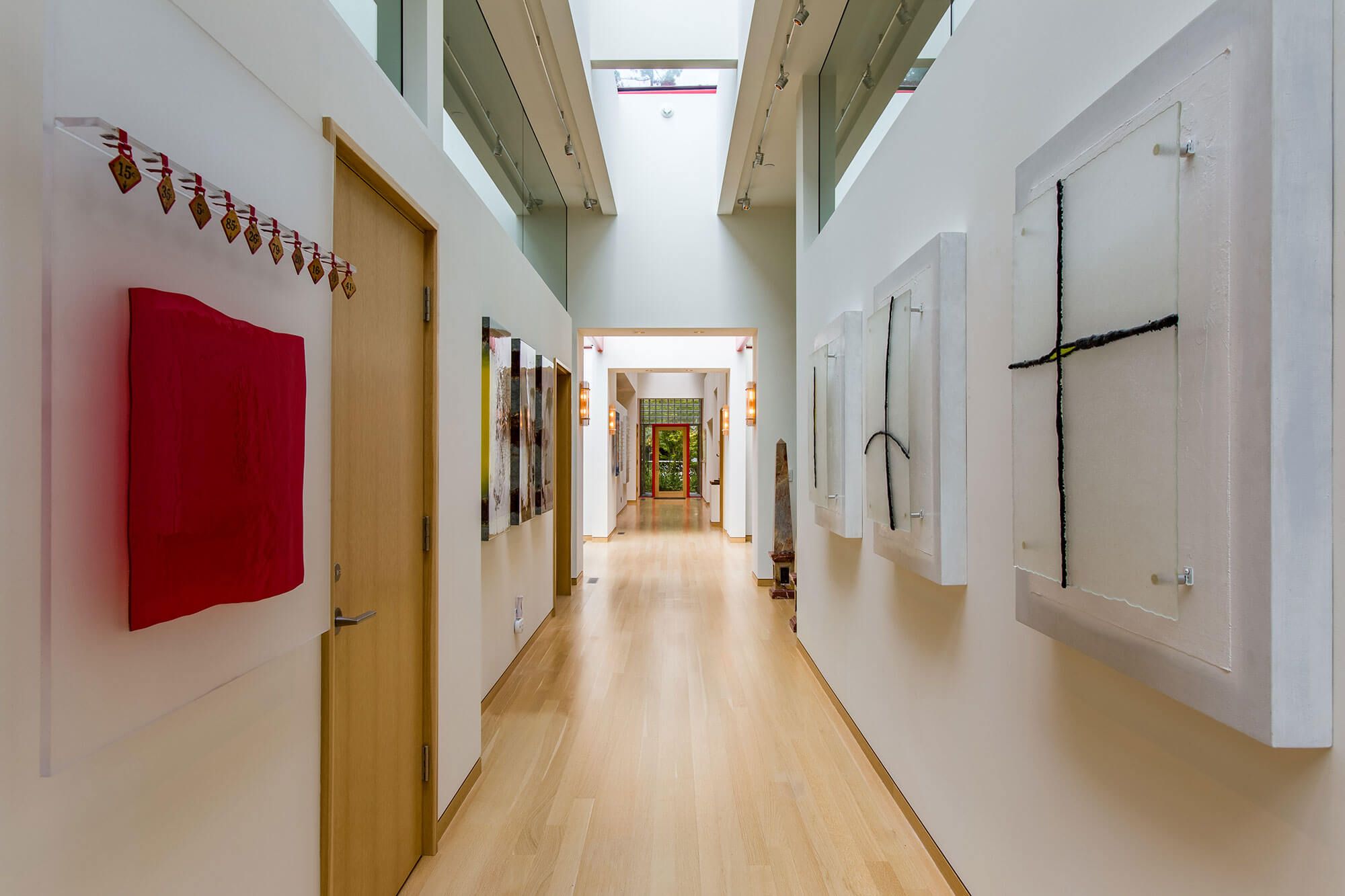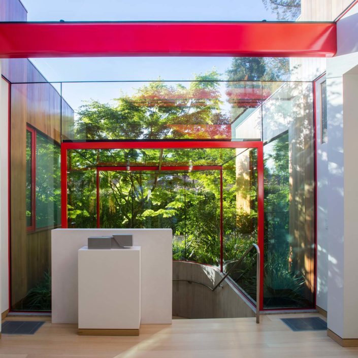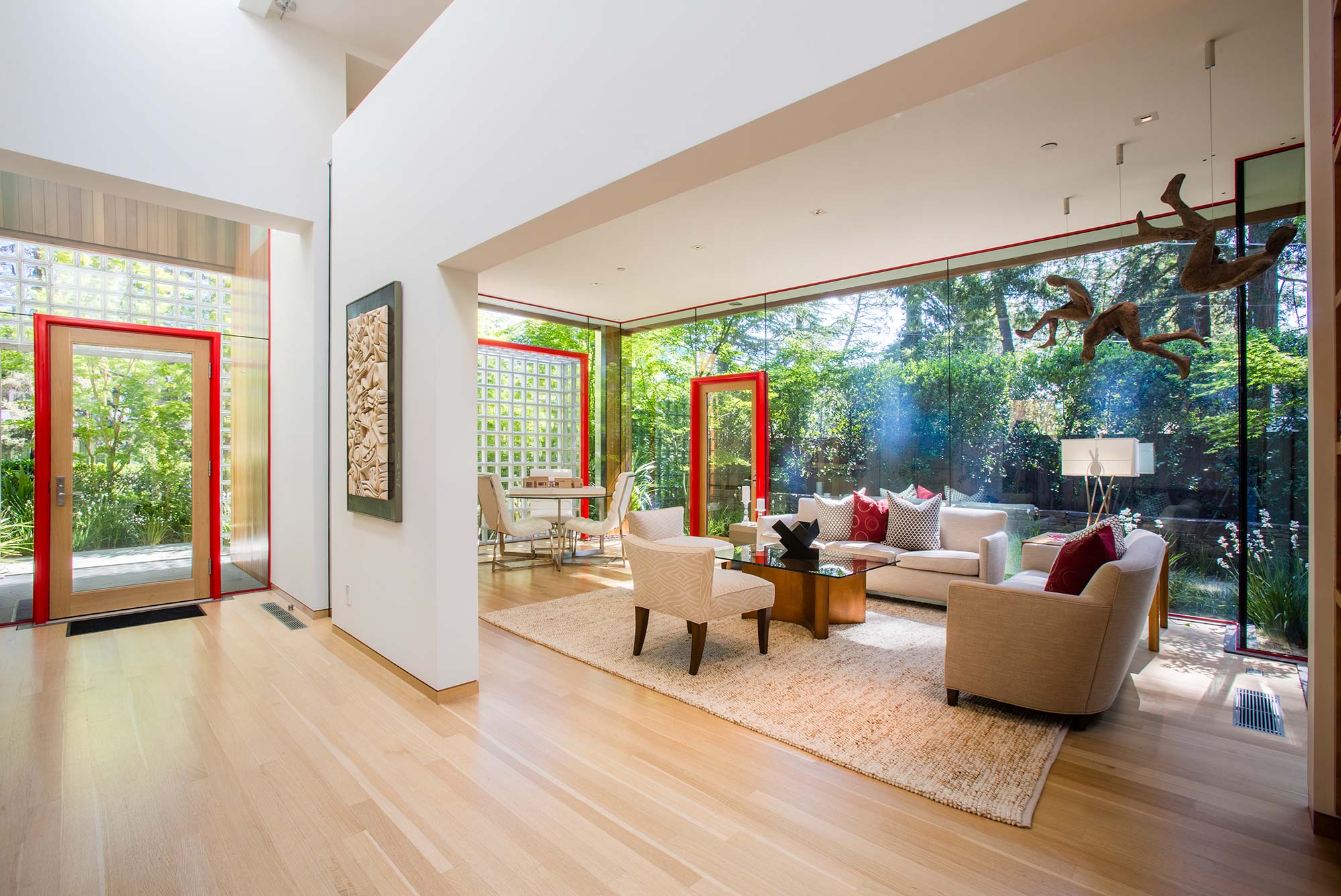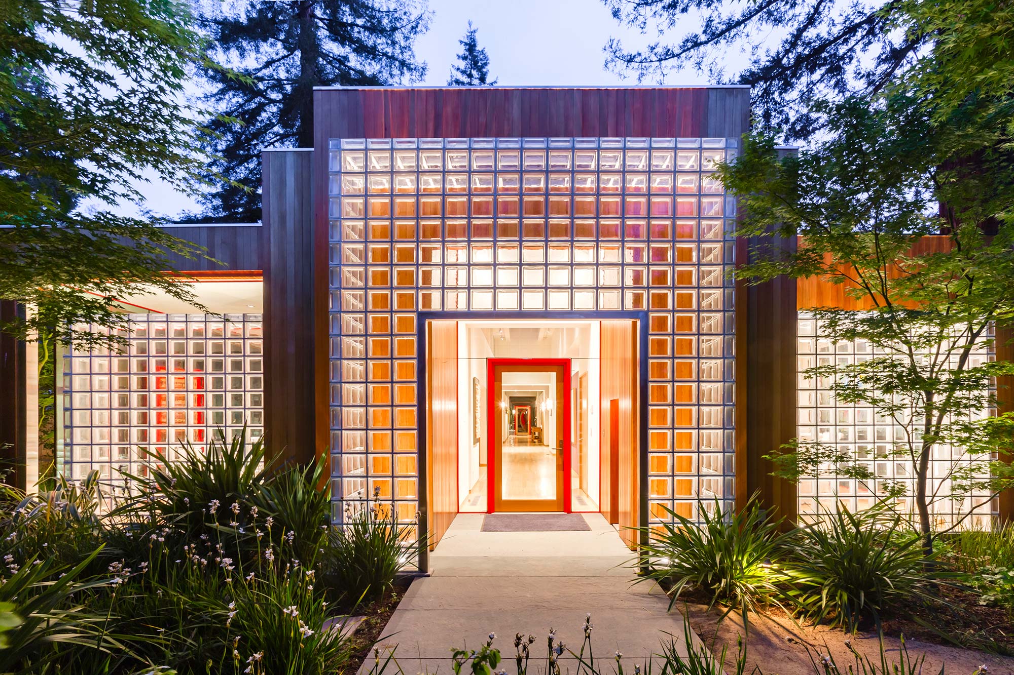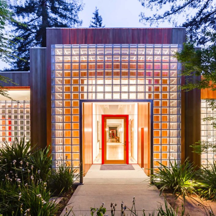 Rear Zen gardens with urn fountain, stacked stone walls, and native, drought-tolerant landscaping.