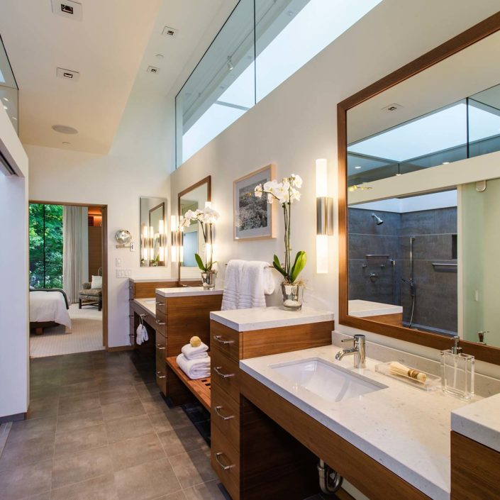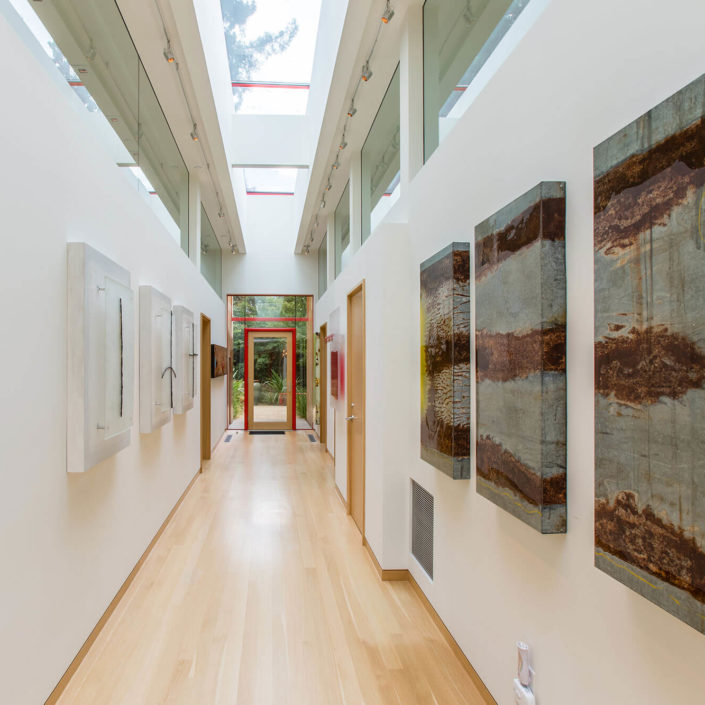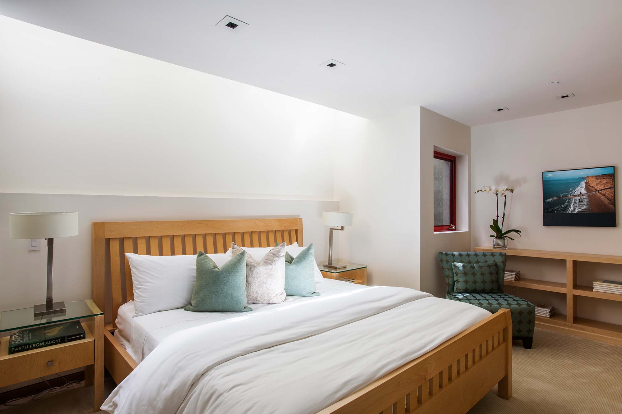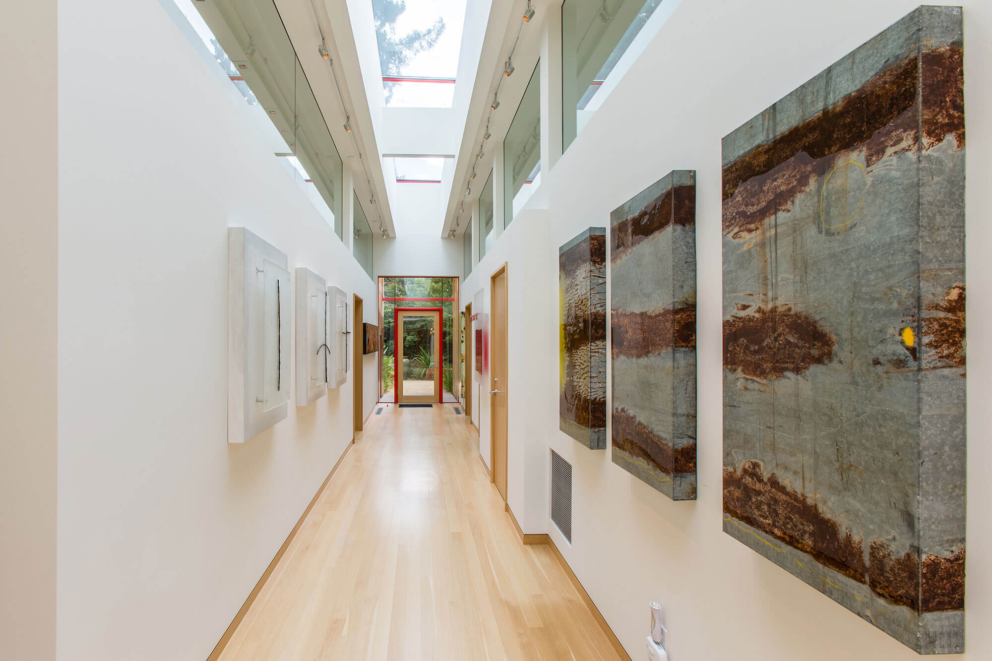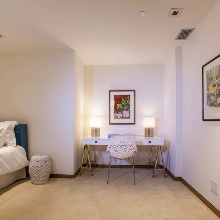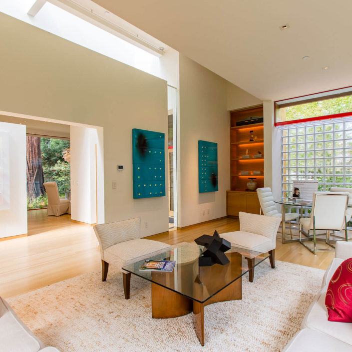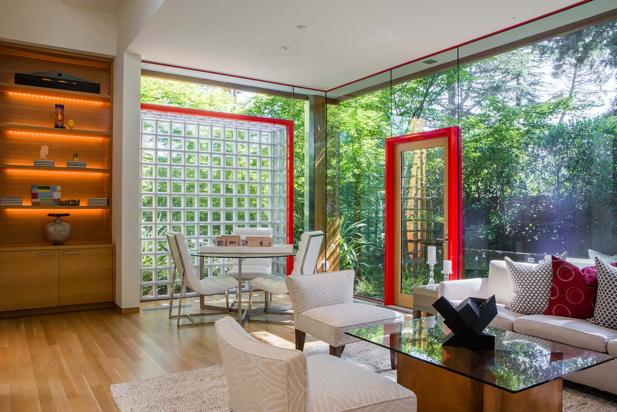 Rear Zen gardens with urn fountain, stacked stone walls, and native, drought-tolerant landscaping.