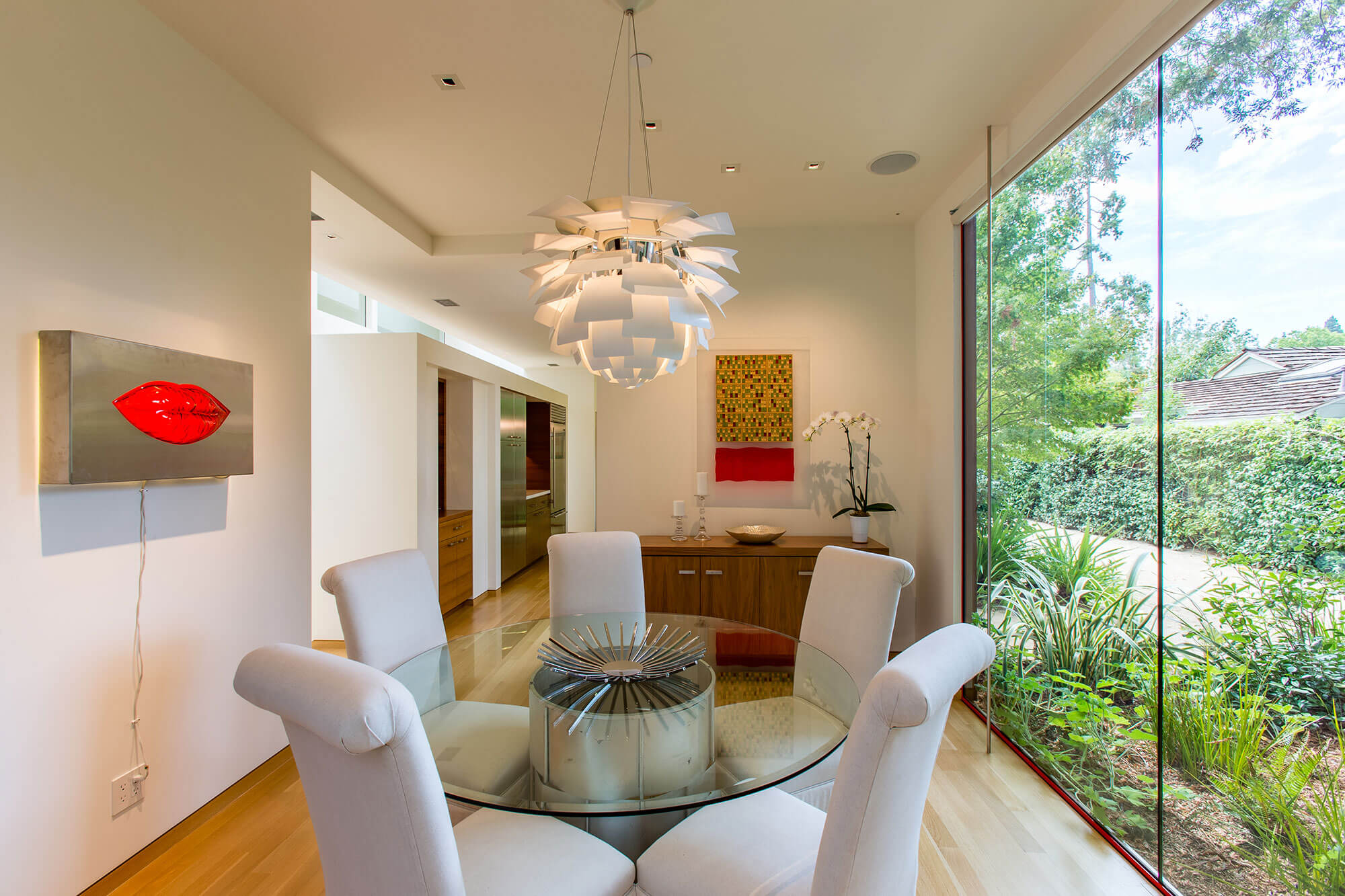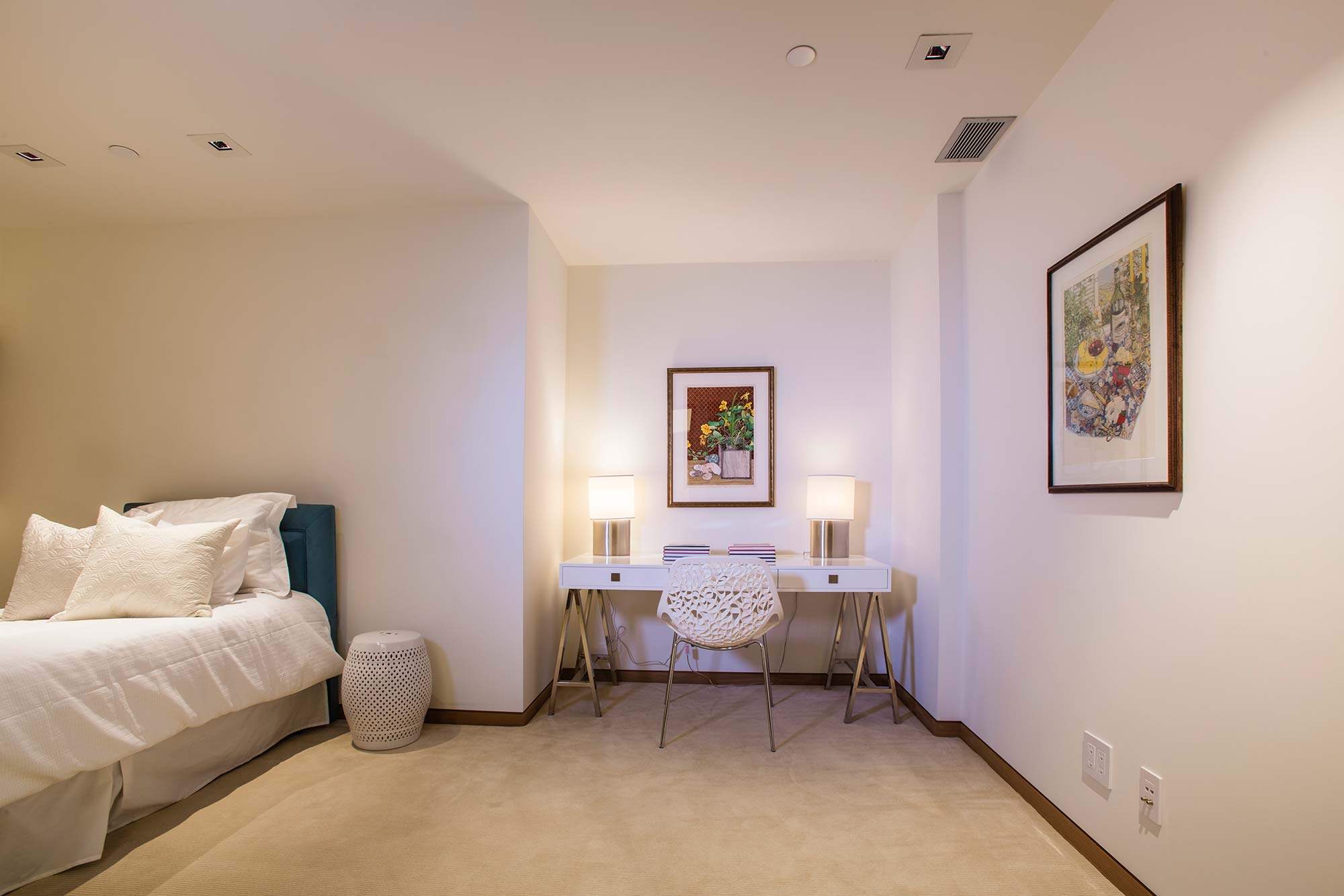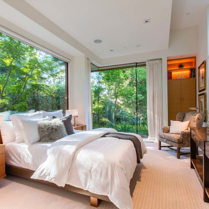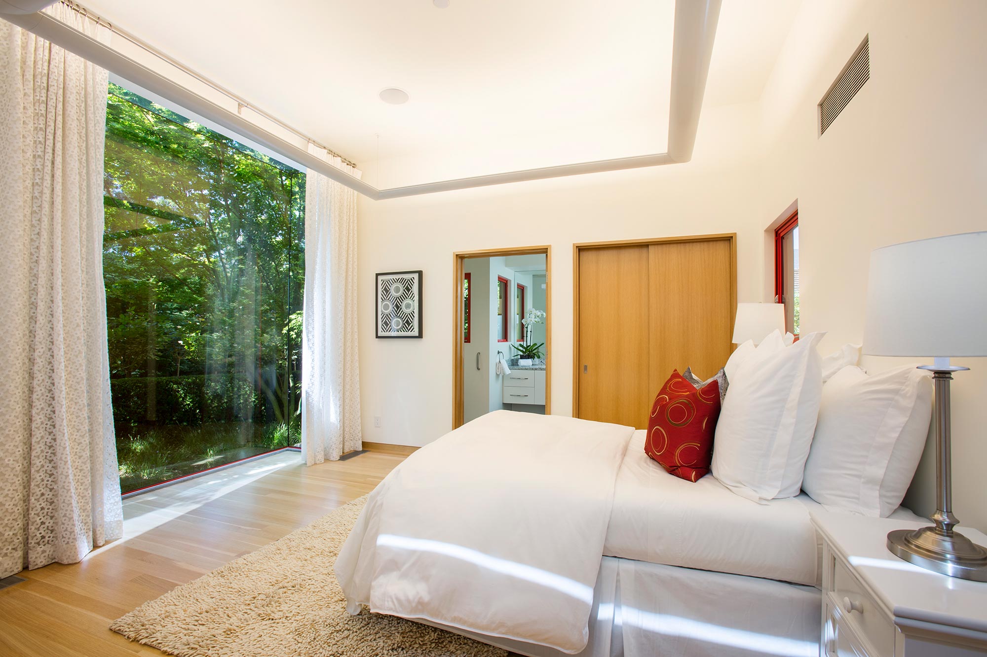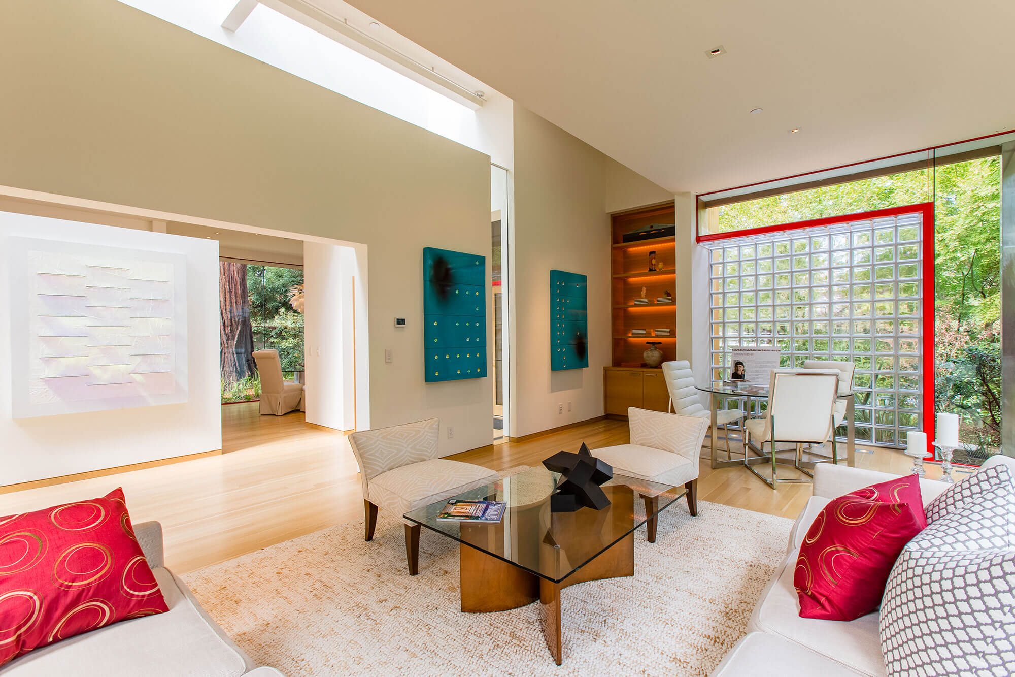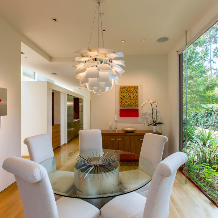 Rear Zen gardens with urn fountain, stacked stone walls, and native, drought-tolerant landscaping.