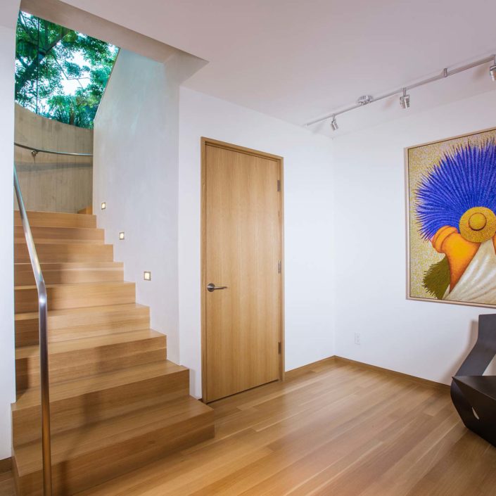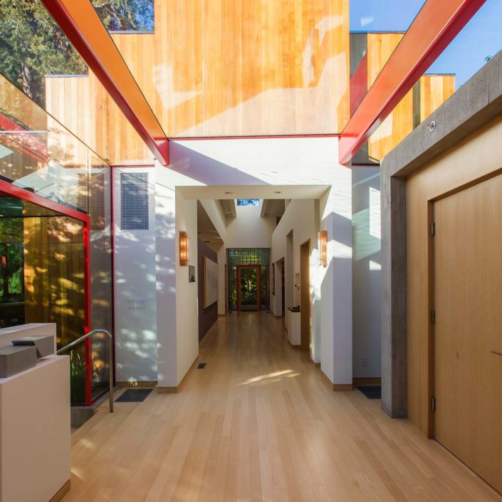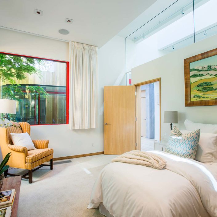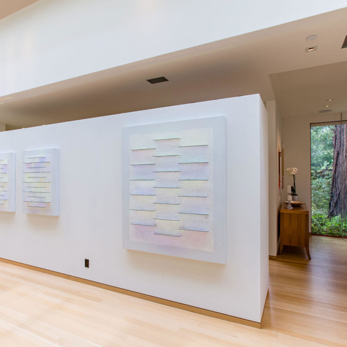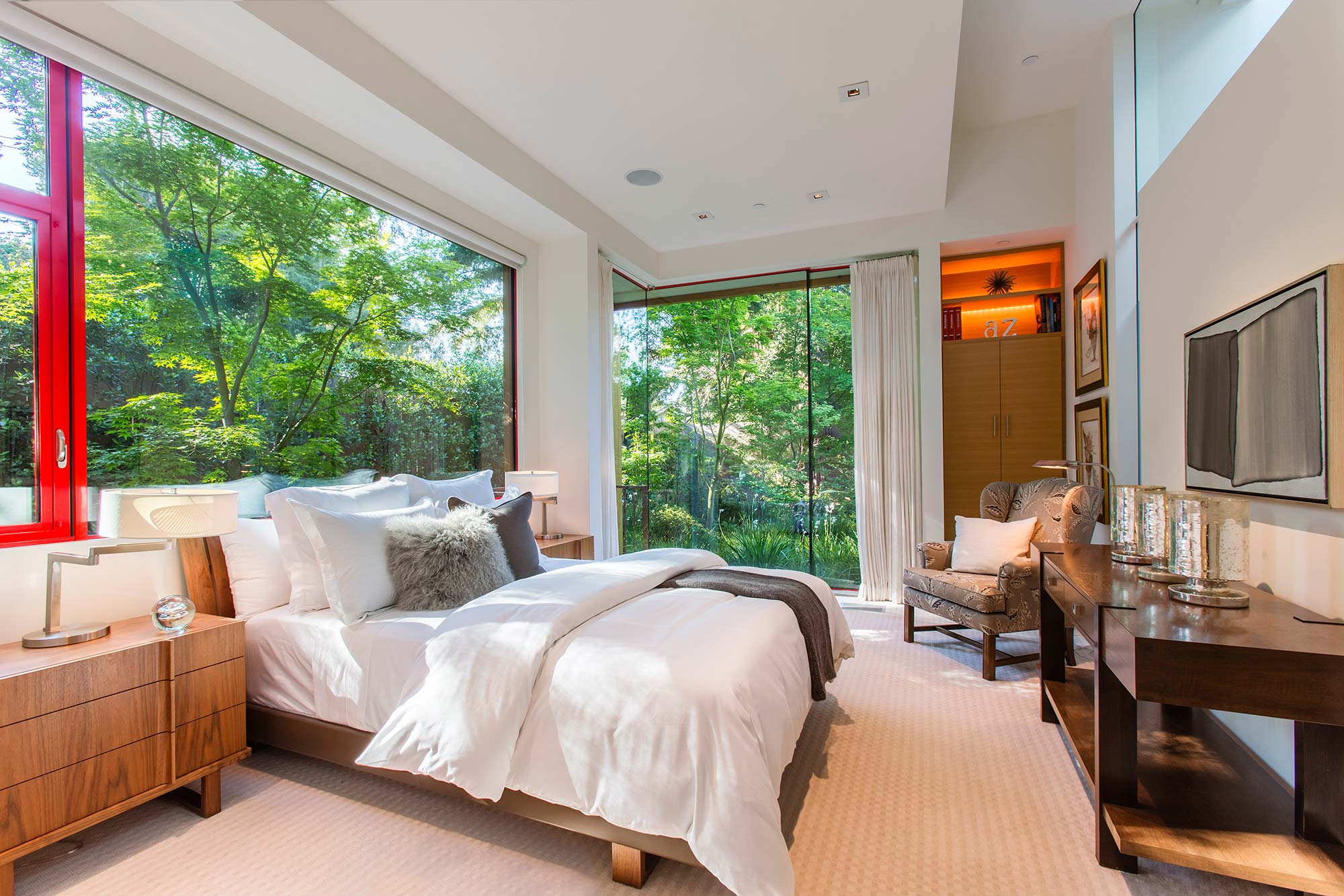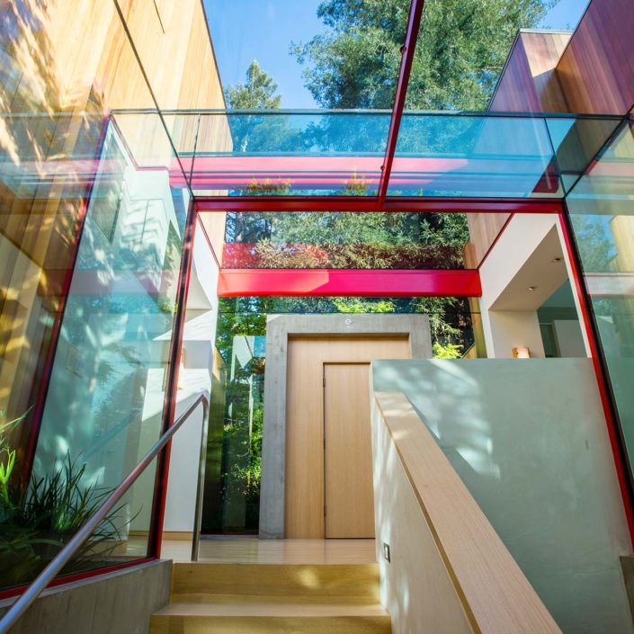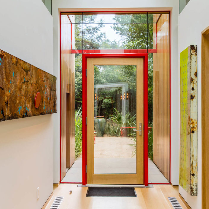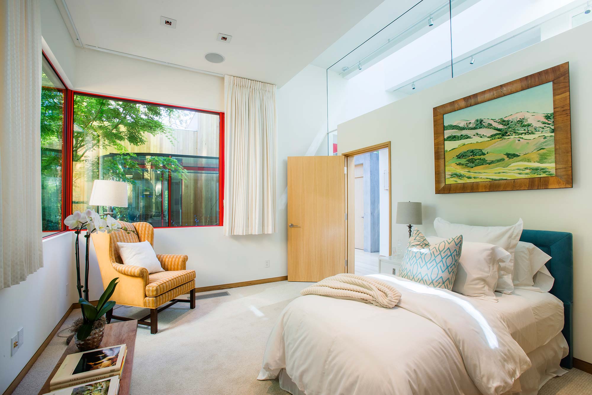 Rear Zen gardens with urn fountain, stacked stone walls, and native, drought-tolerant landscaping.