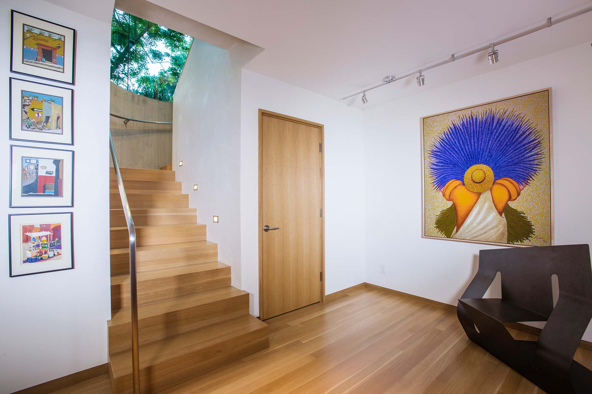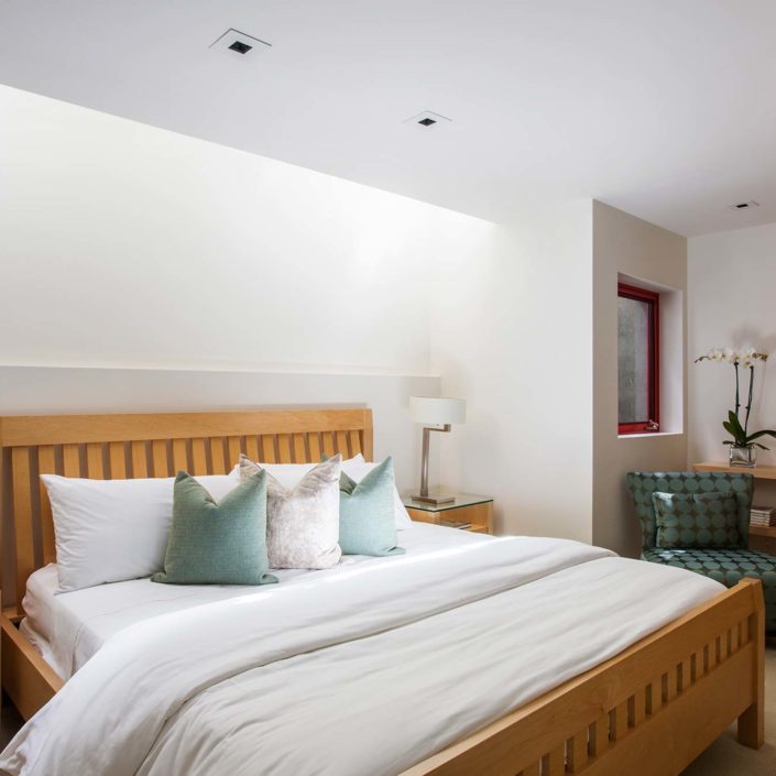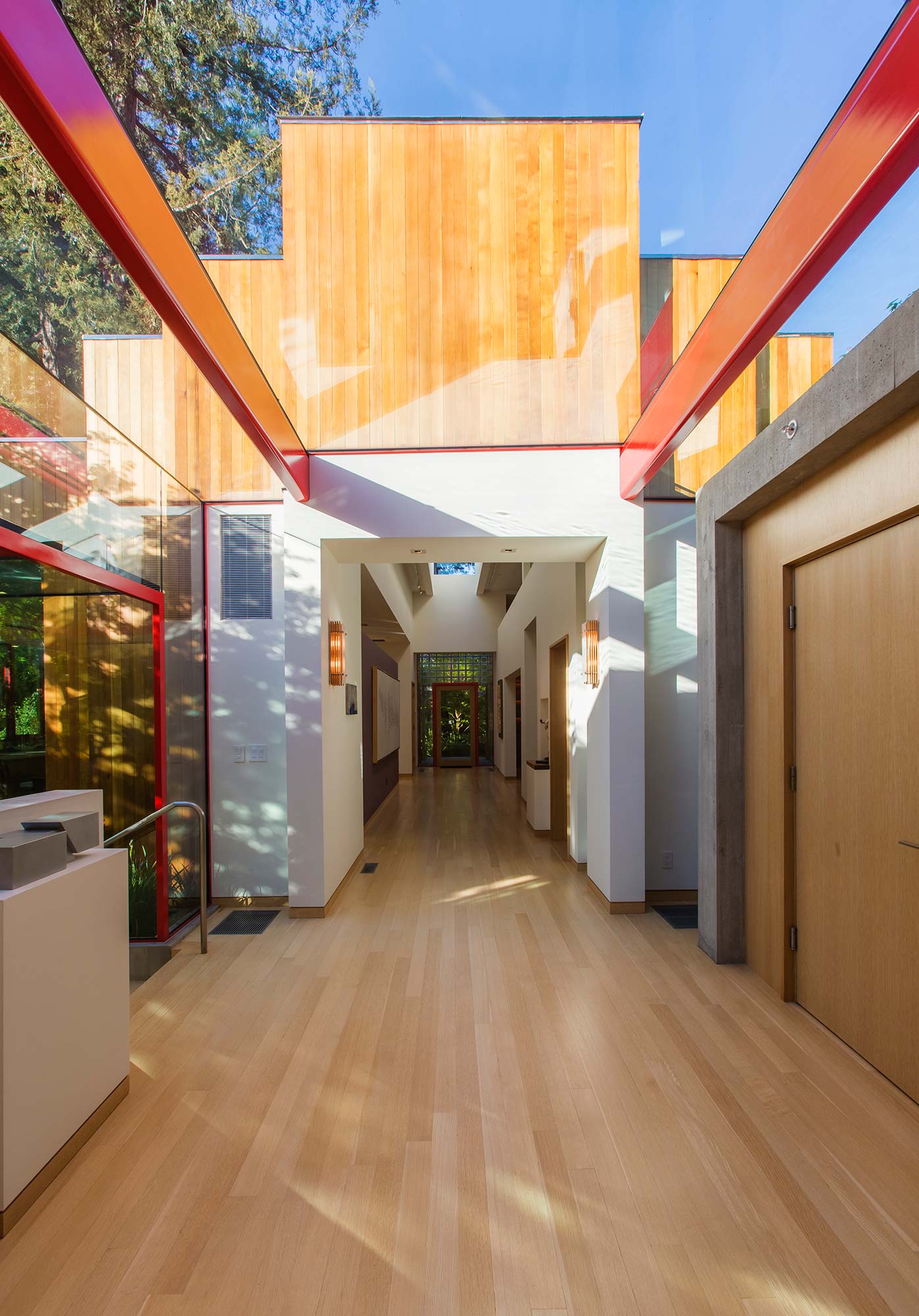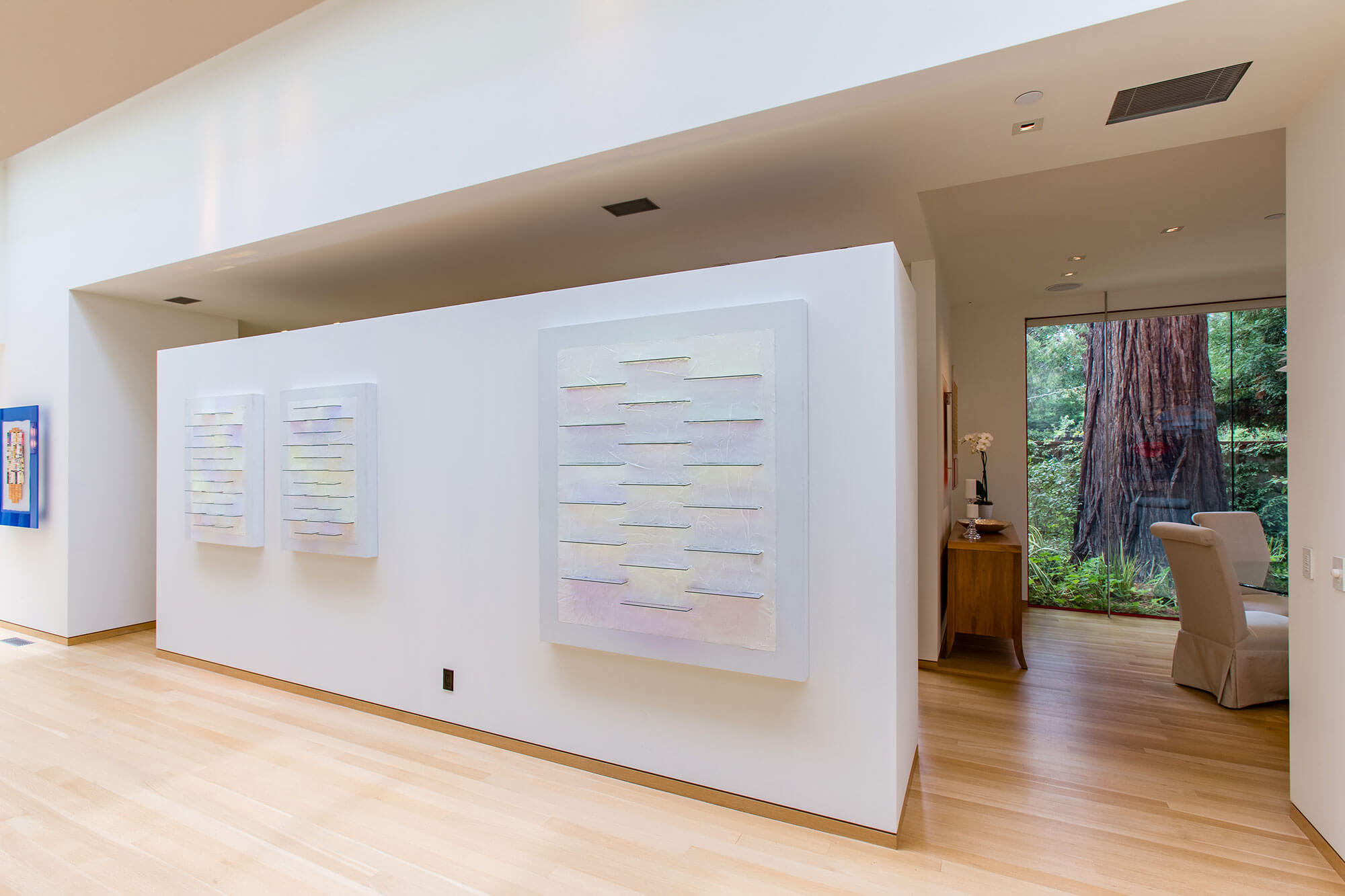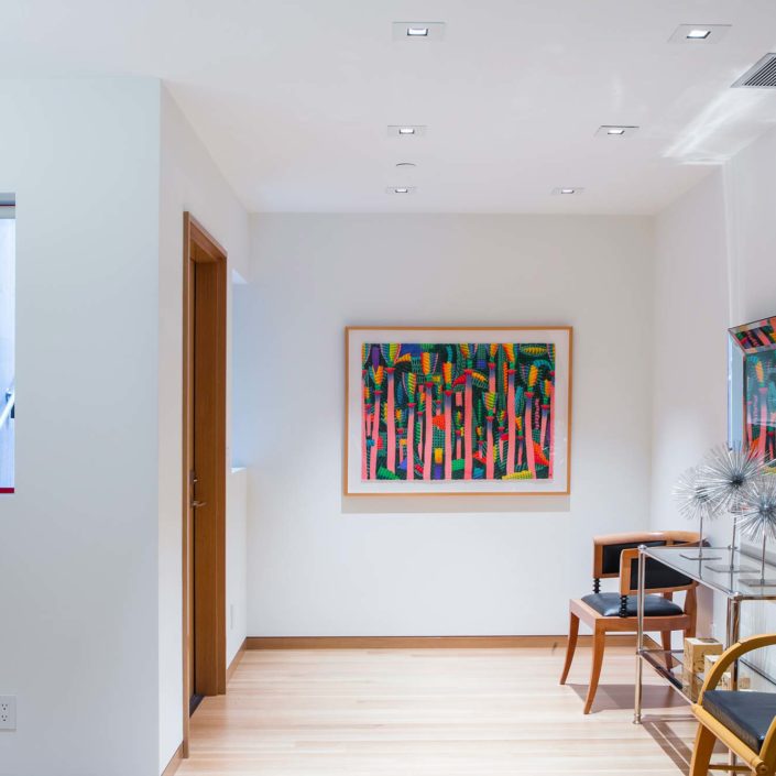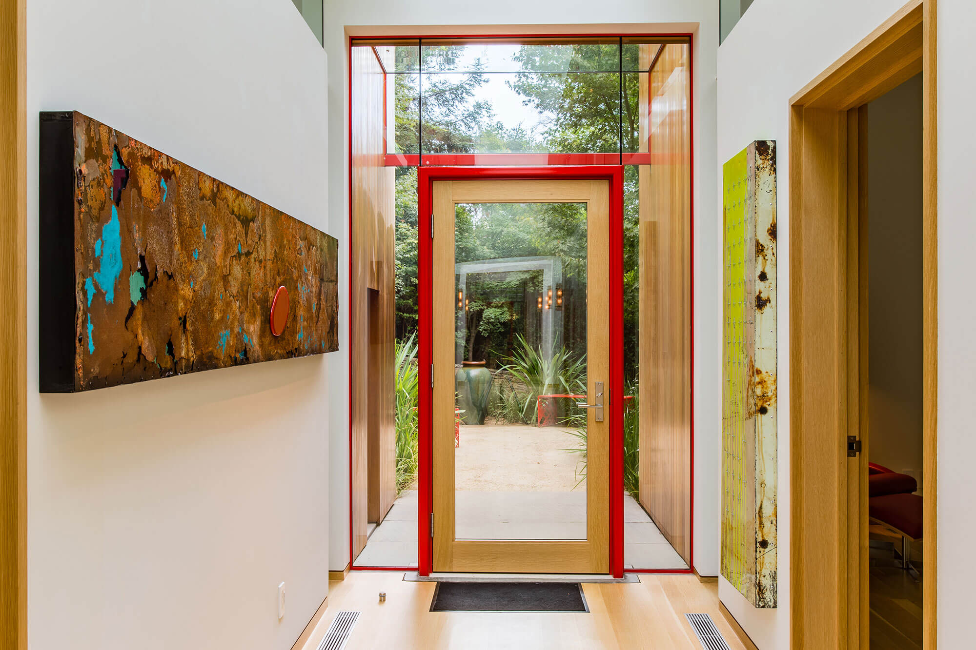 Rear Zen gardens with urn fountain, stacked stone walls, and native, drought-tolerant landscaping.