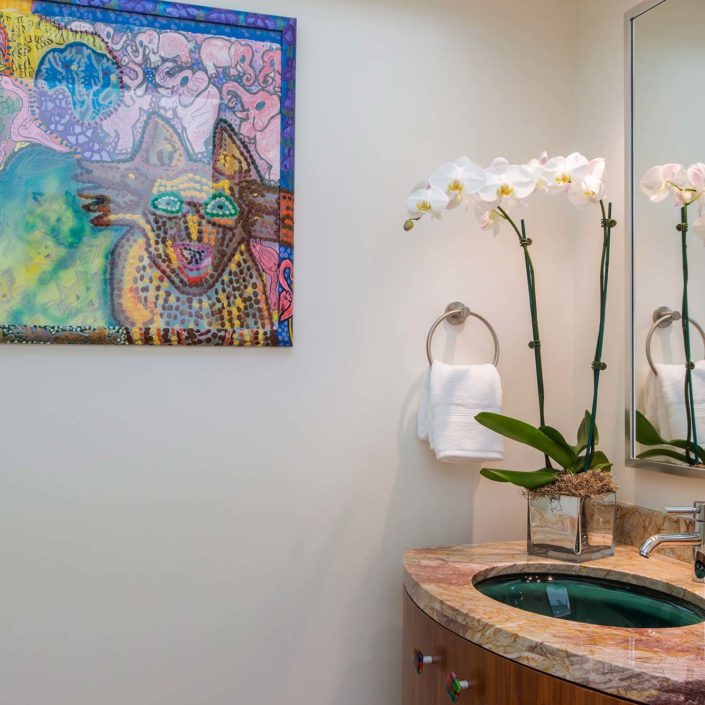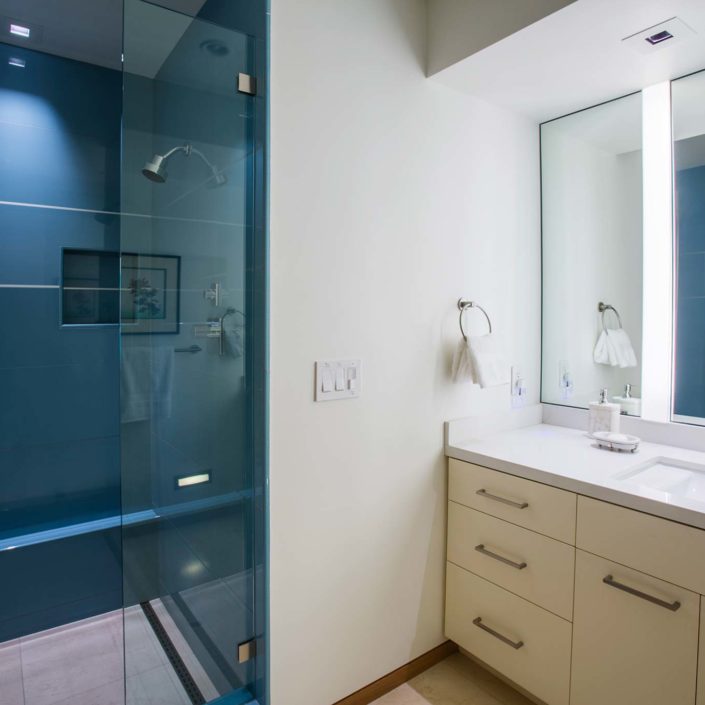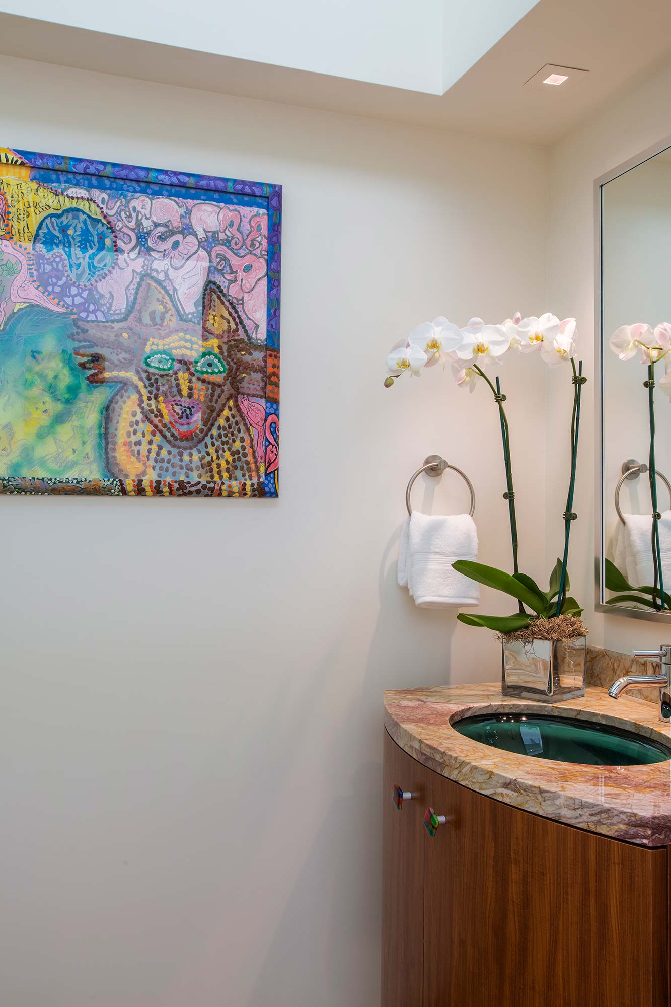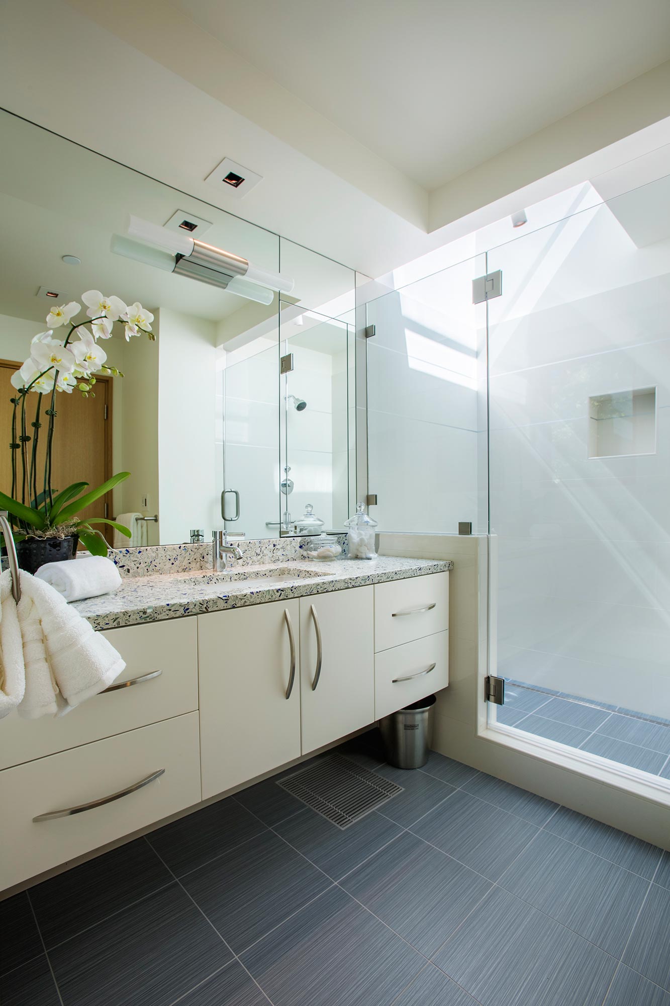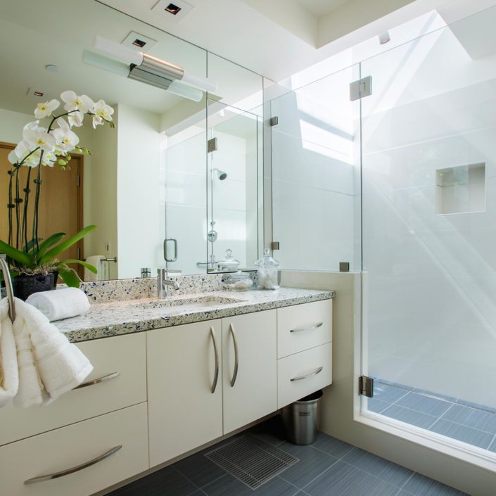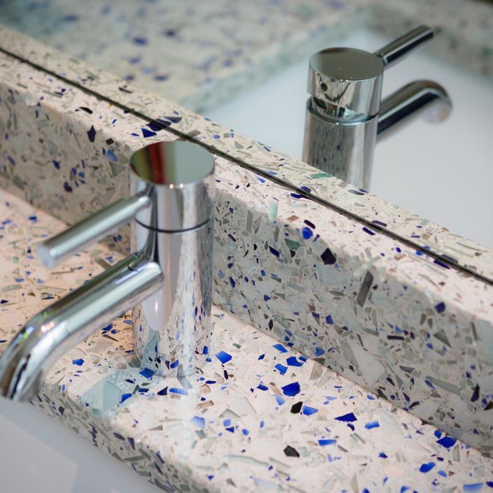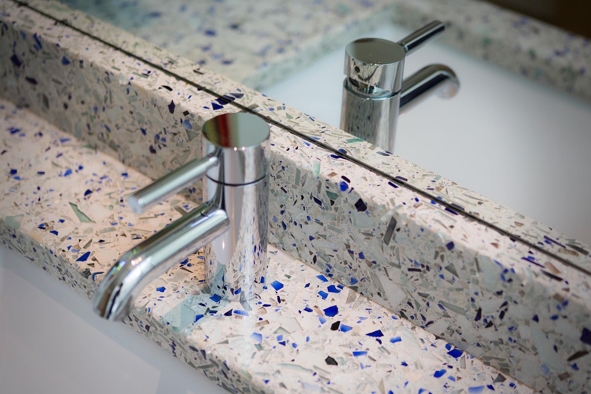 Main-level laundry room with sink and Miele washer and dryer with recycled glass/quartz counters.