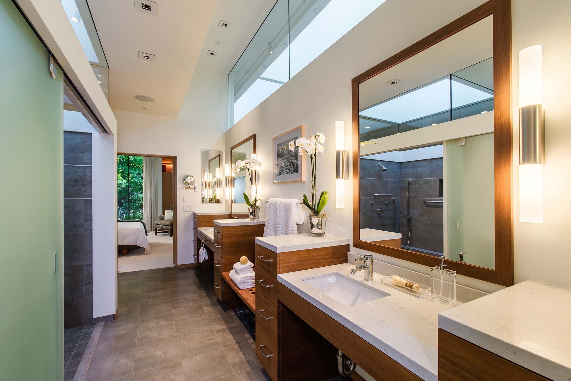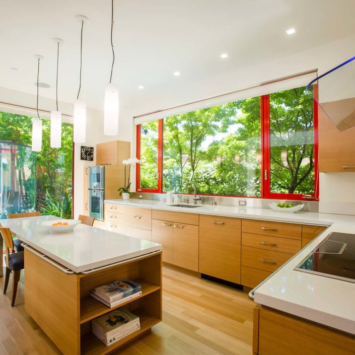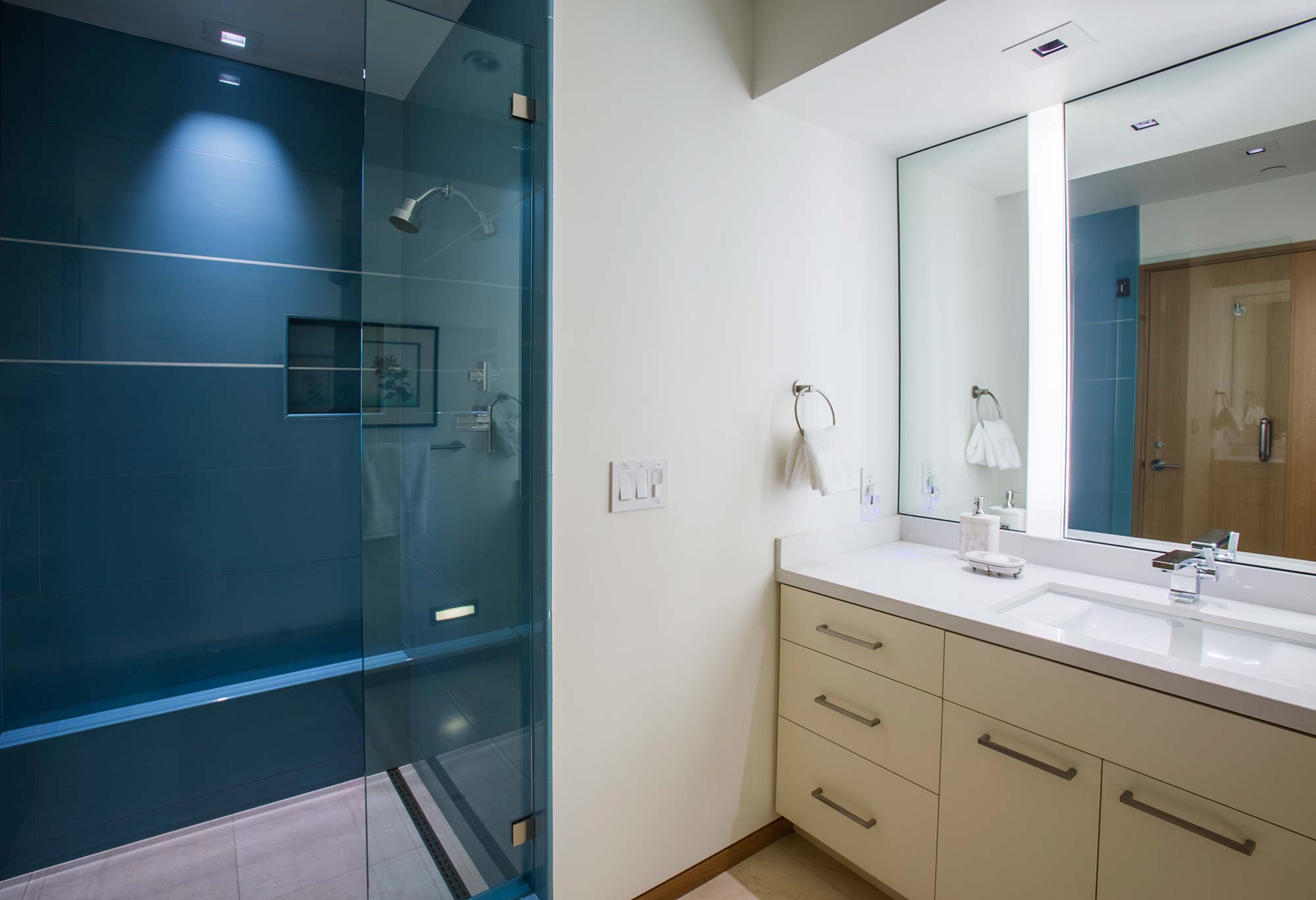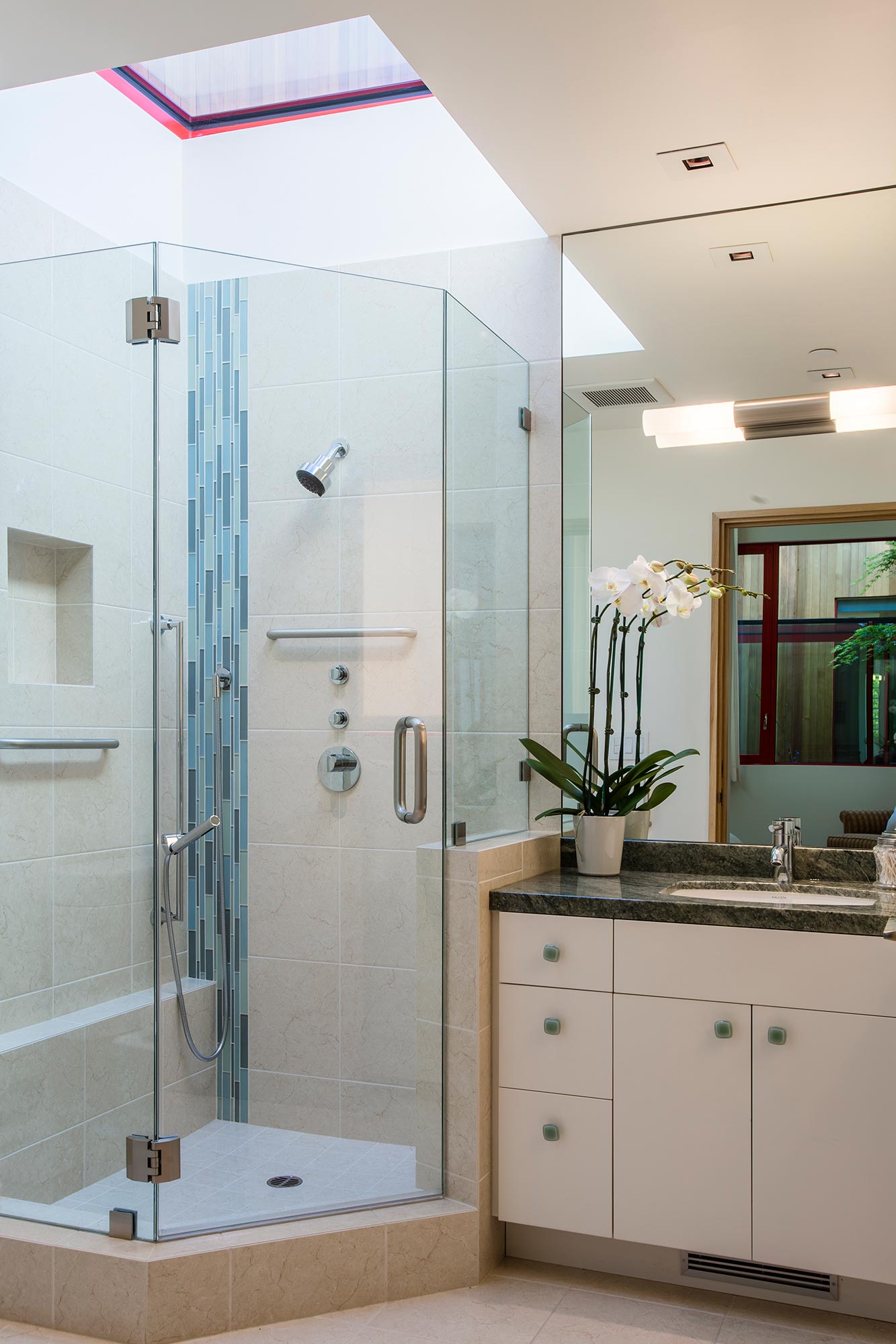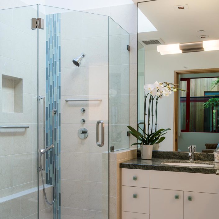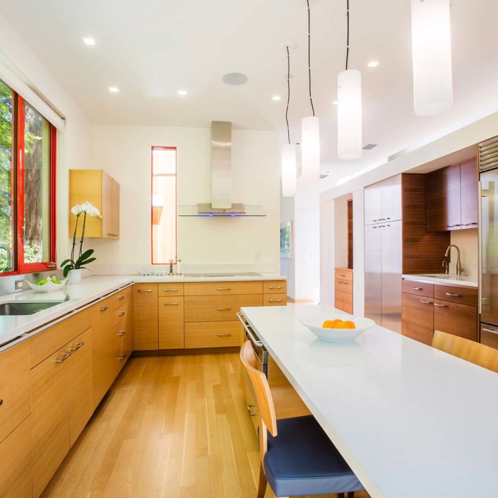 Main-level laundry room with sink and Miele washer and dryer with recycled glass/quartz counters.
