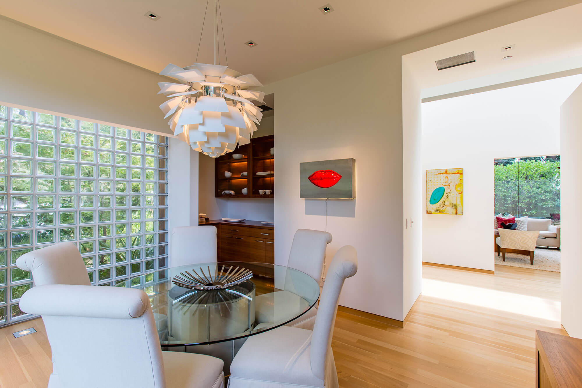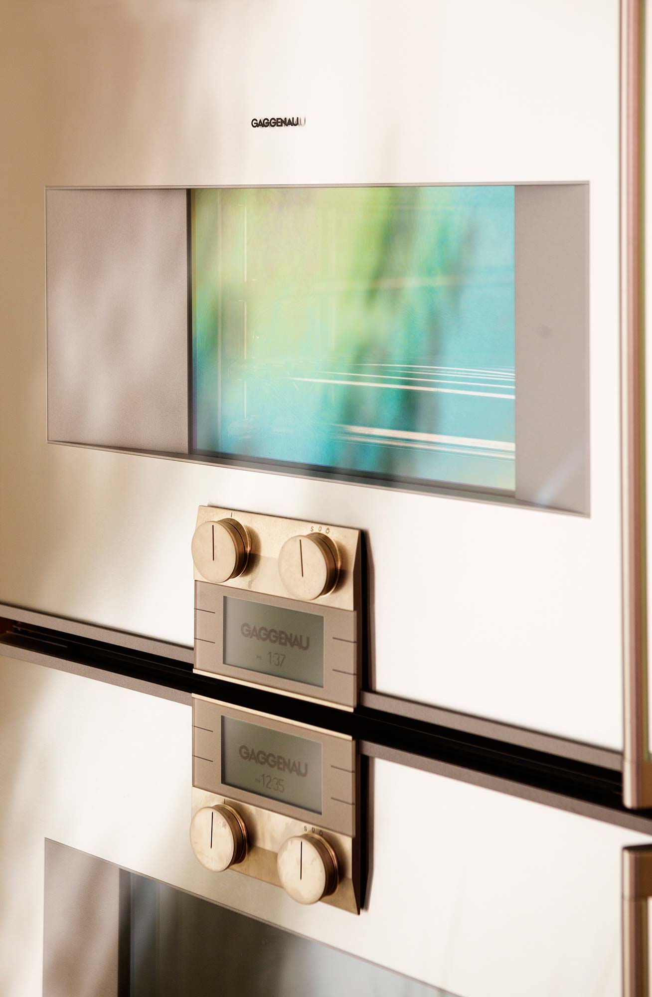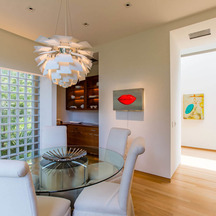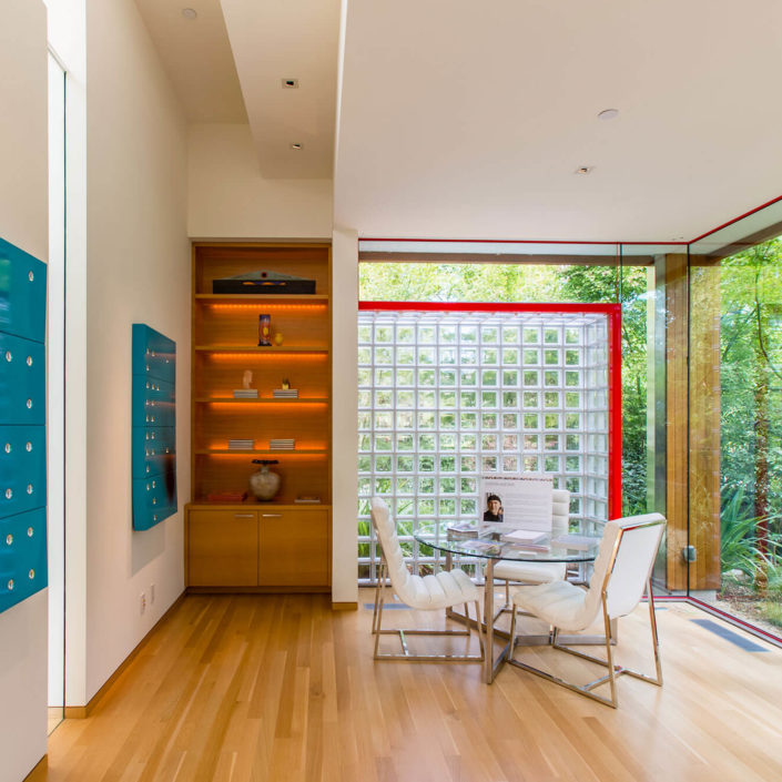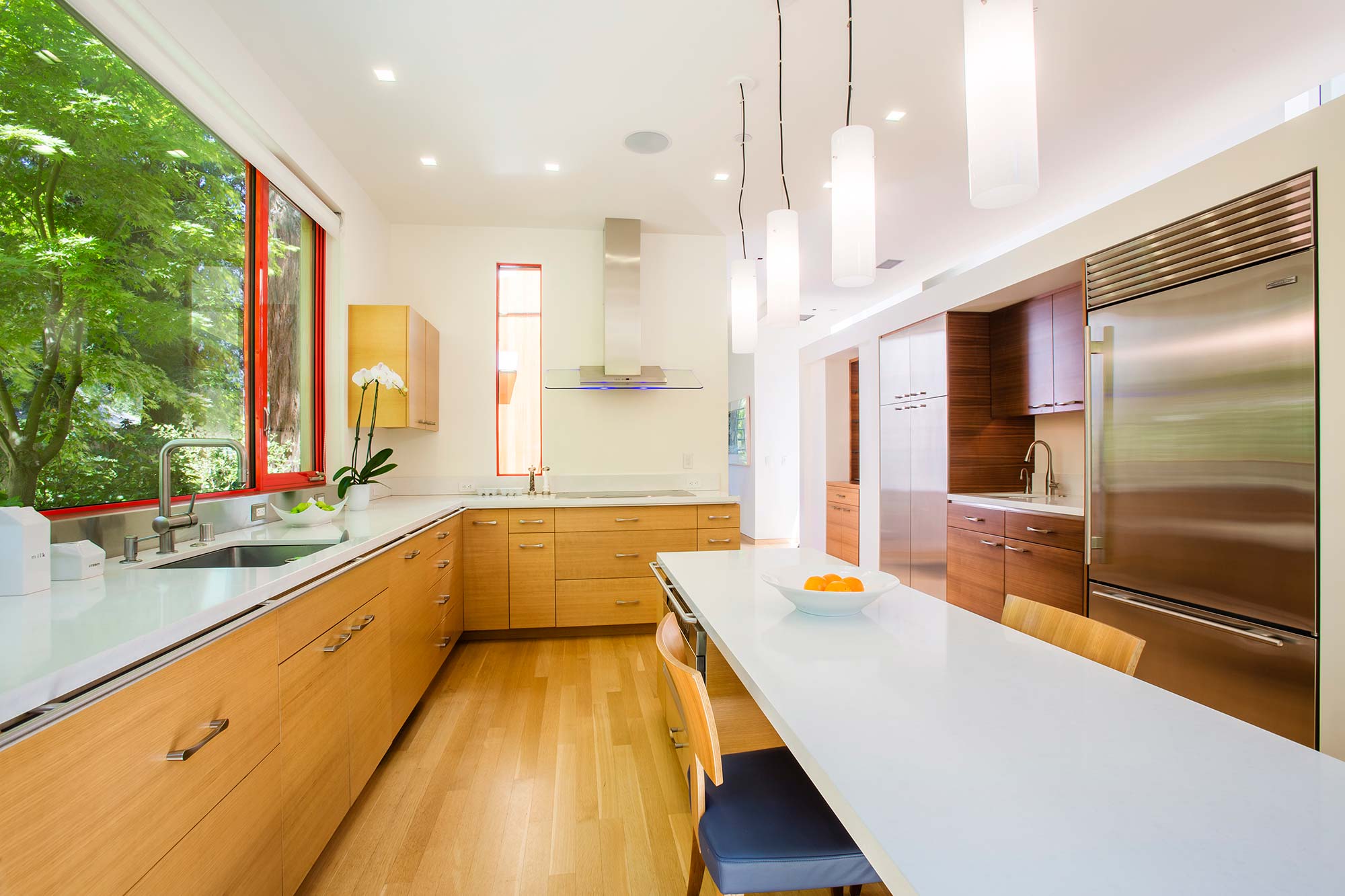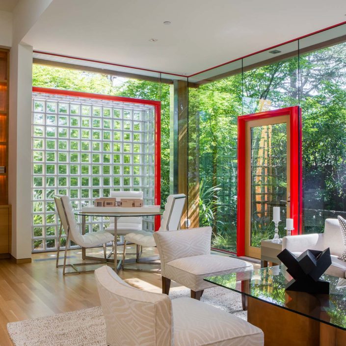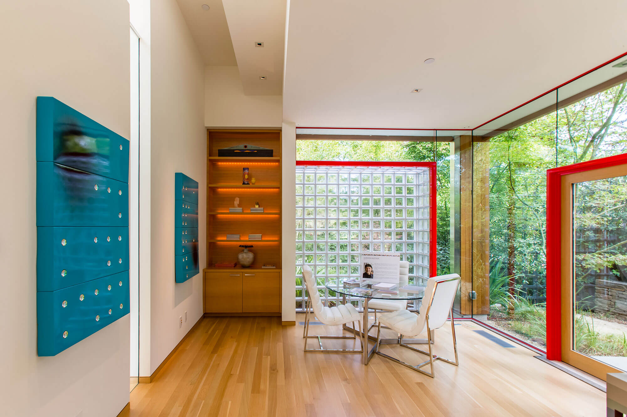 Main-level laundry room with sink and Miele washer and dryer with recycled glass/quartz counters.