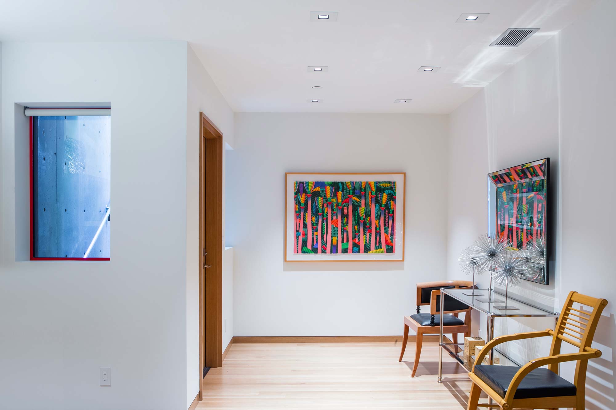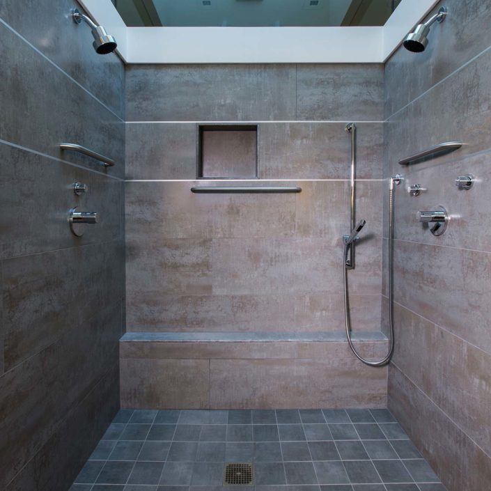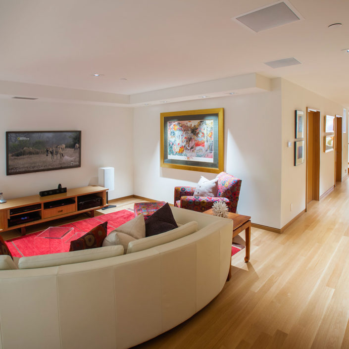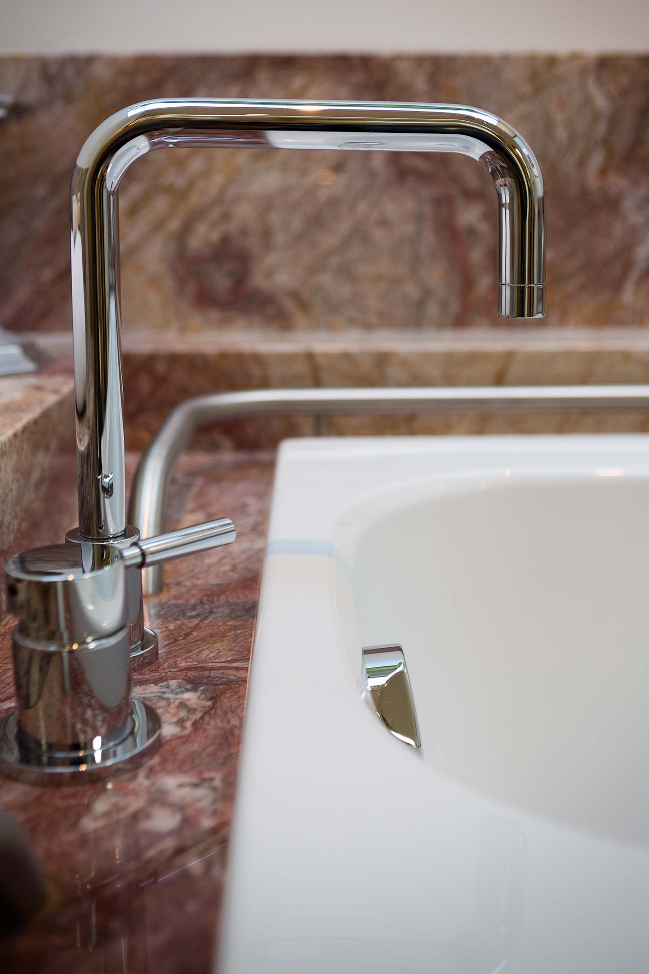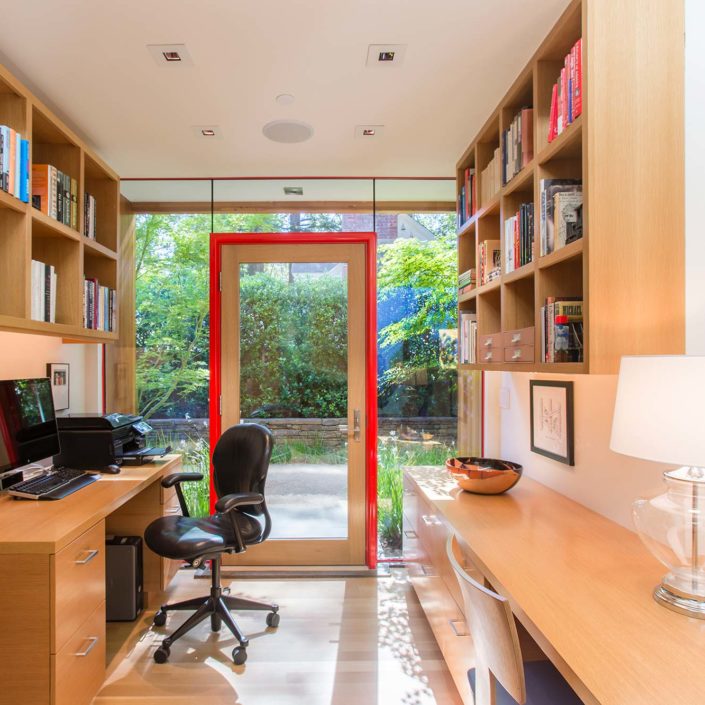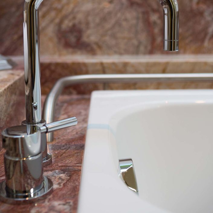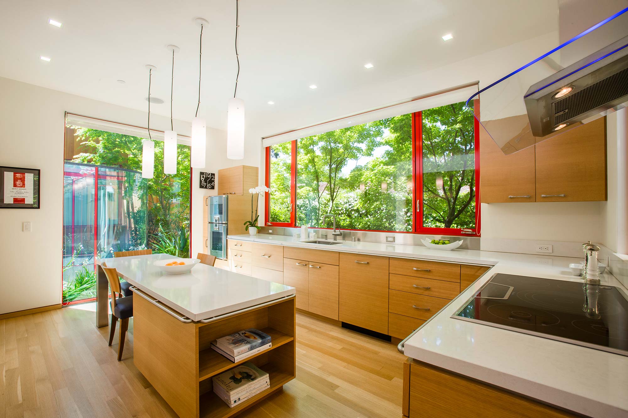 Main-level laundry room with sink and Miele washer and dryer with recycled glass/quartz counters.