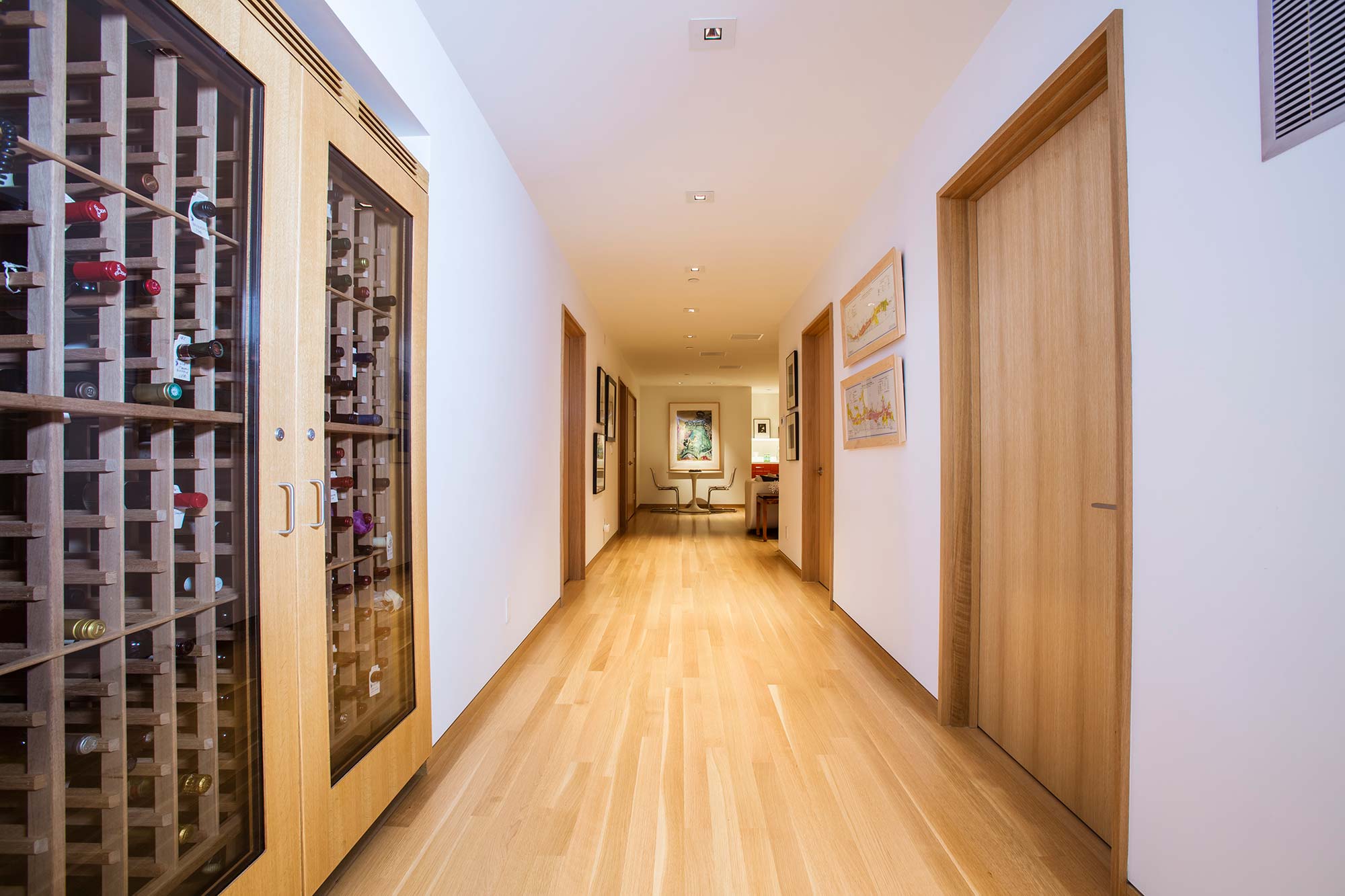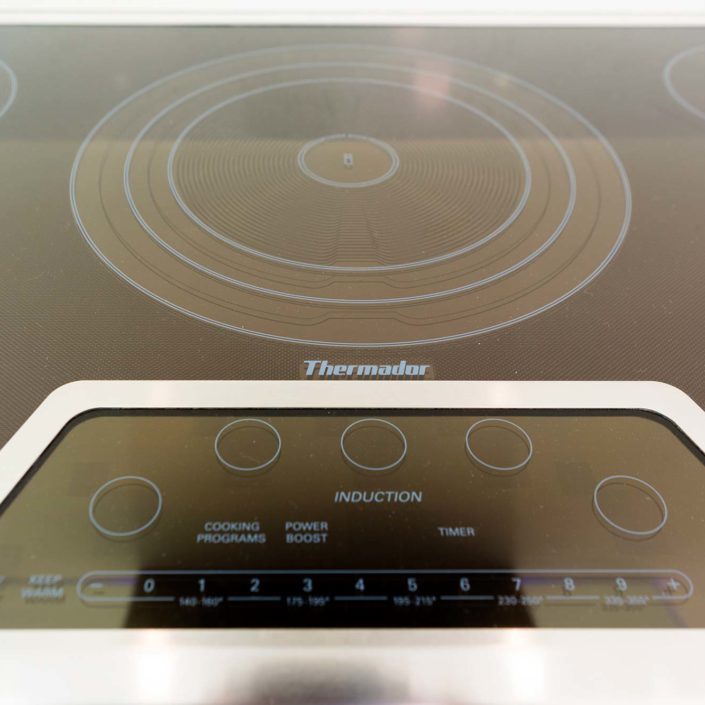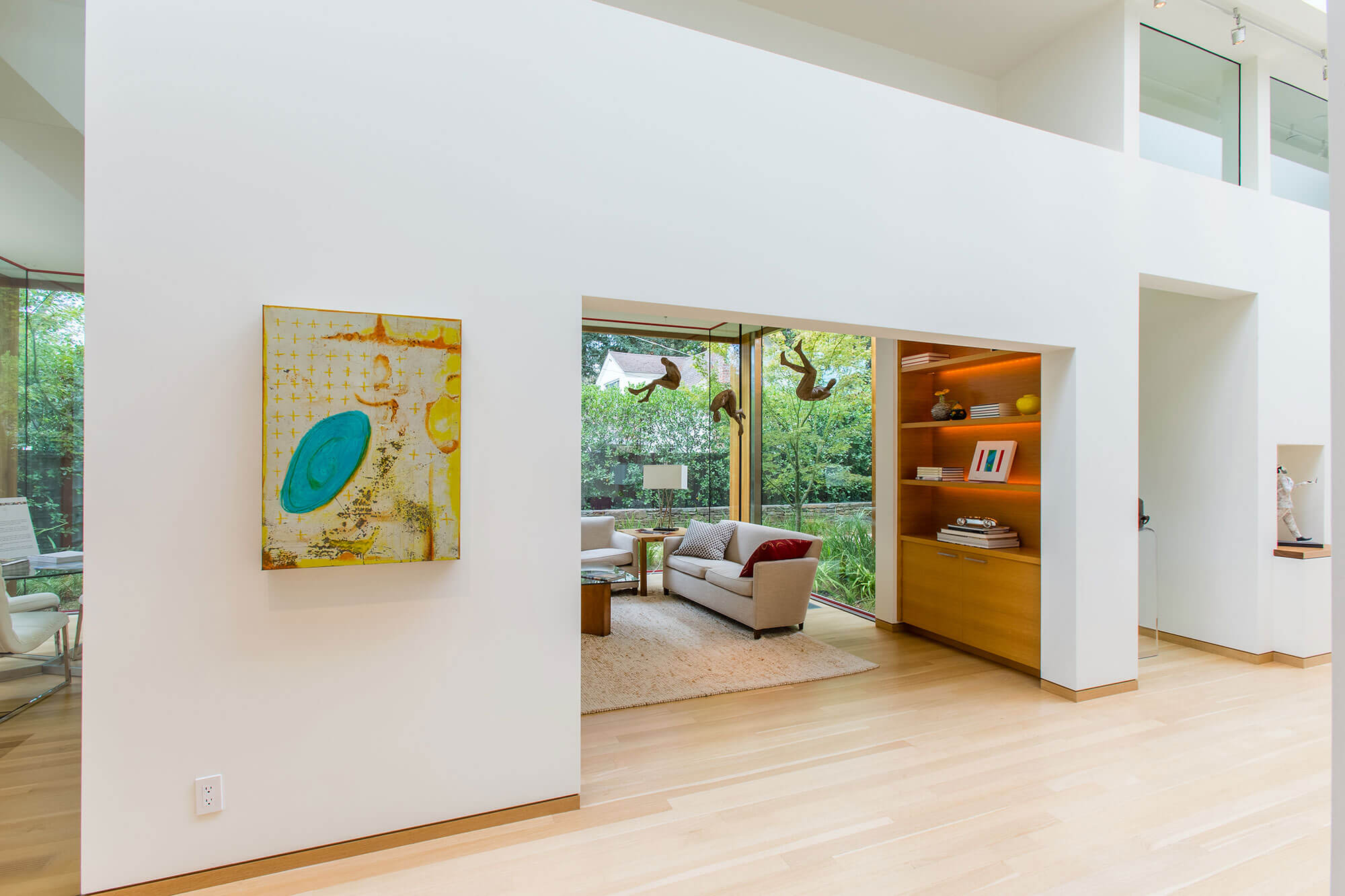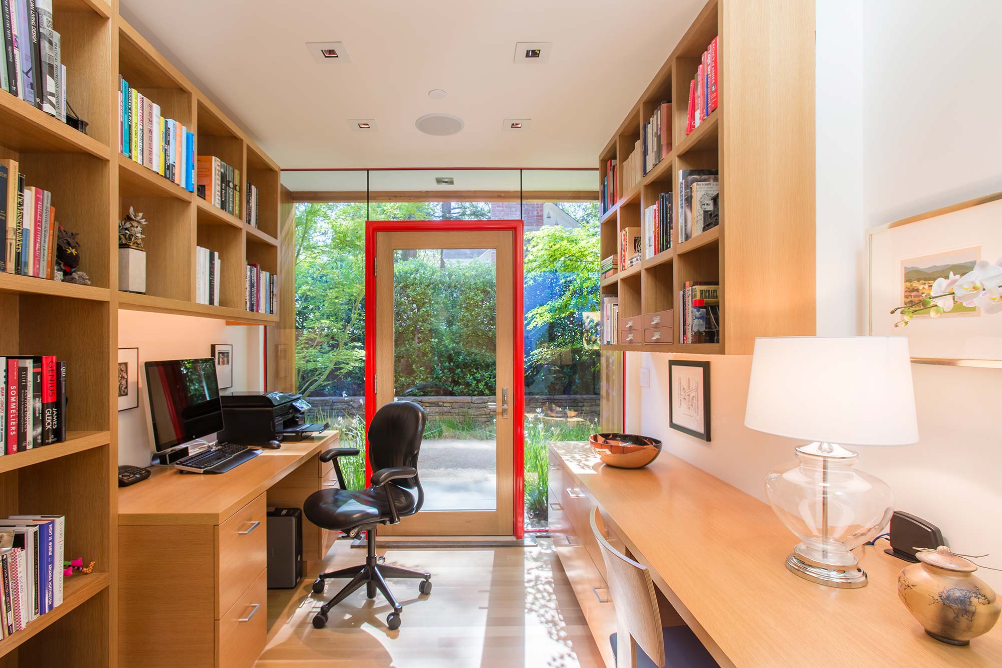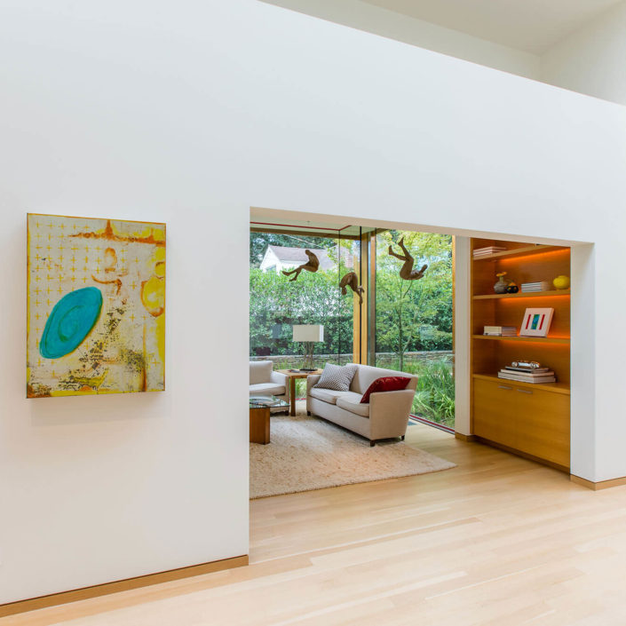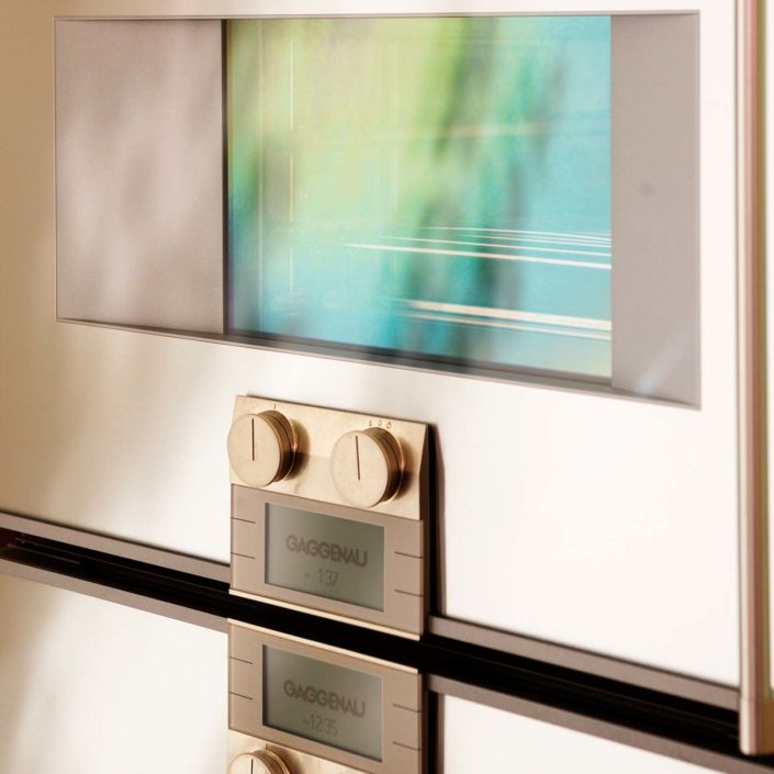 Main-level laundry room with sink and Miele washer and dryer with recycled glass/quartz counters.