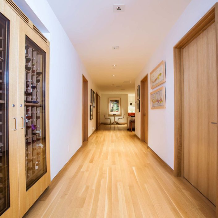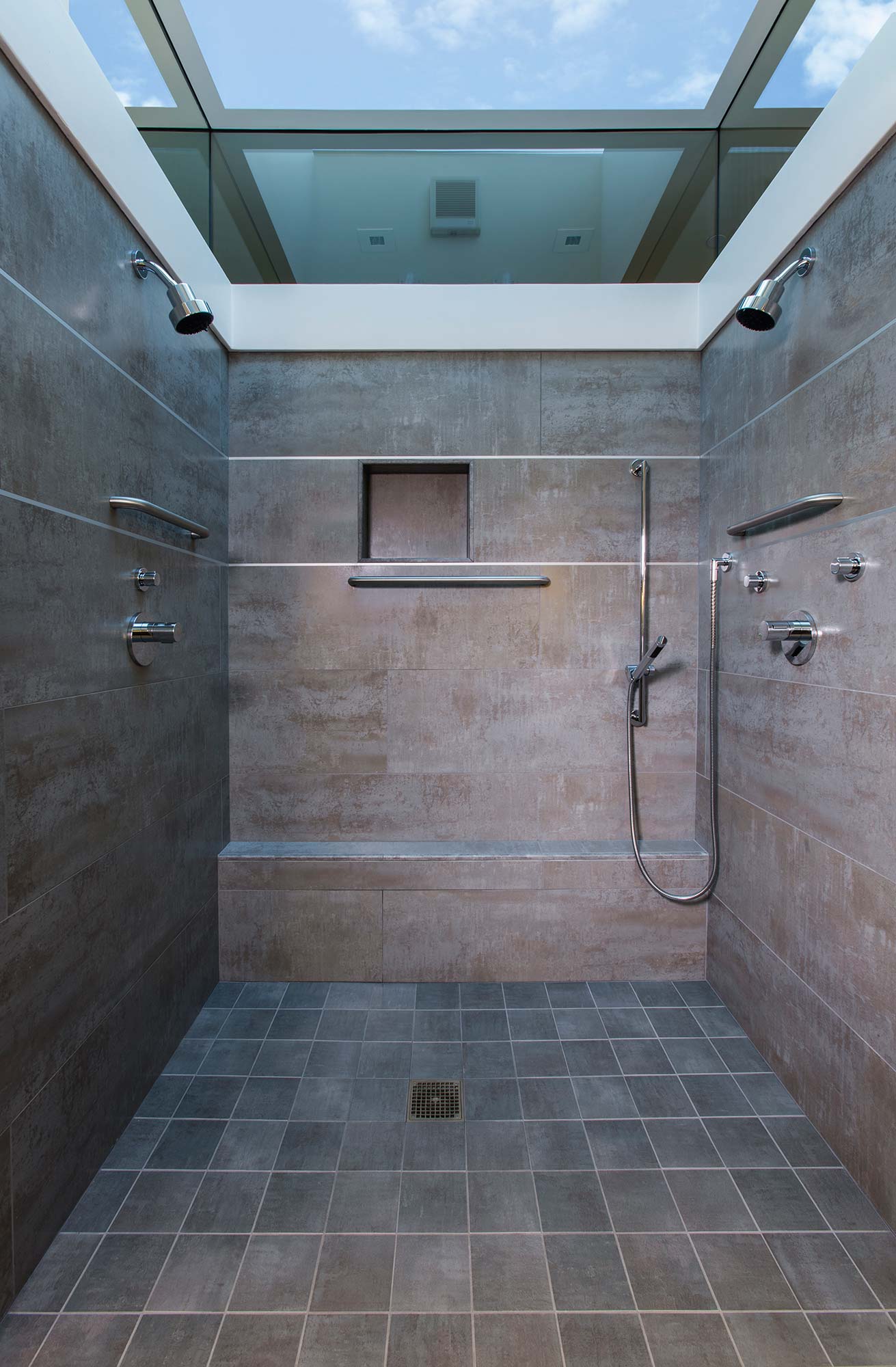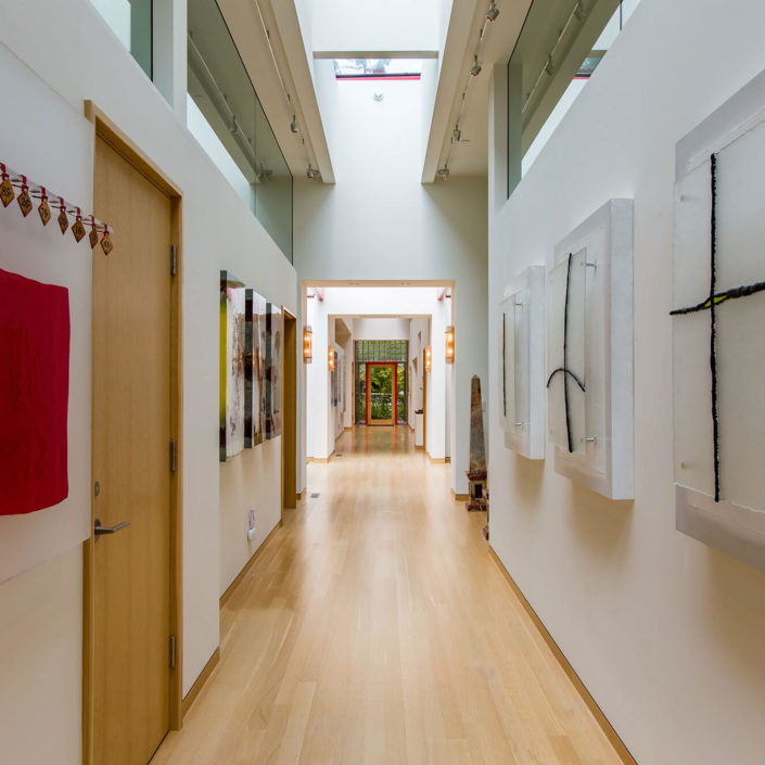 Photovoltaic panels on the main roof producing electric power and solar panels on the garage producing hot water.